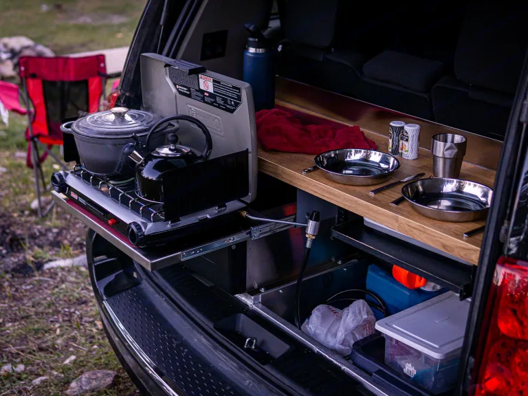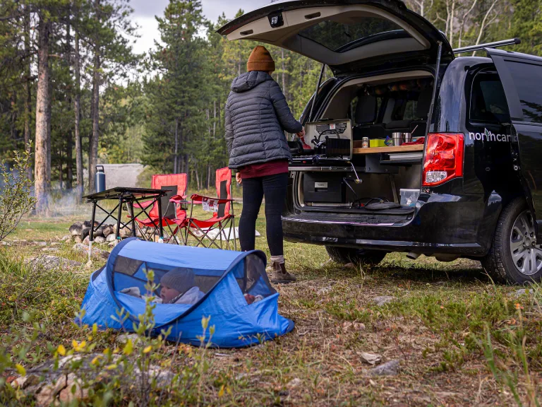 The Moose Van is a converted van that seats 5 and sleeps 2 (or up to 4 with addition of rooftop tent) and comes with storage space for bedding and camp gear in the mid vehicle storage box. It's interior bed sets up in seconds and has a comfortable 6' x 4' foam mattress.Located at the back is a fully equipped kitchen for cooking up a gourmet meal wherever you might be. Included is a 30l electric drawer fridge, 2 burner camp stove, countertop and stowable wash basin.Lastly the campervan equipped with a roof rack and the ability to mount extras such as a rooftop tent to sleep additional travellers, a rooftop carrier for extra storage.Other things to noteNo smoking in the van thank-you :)