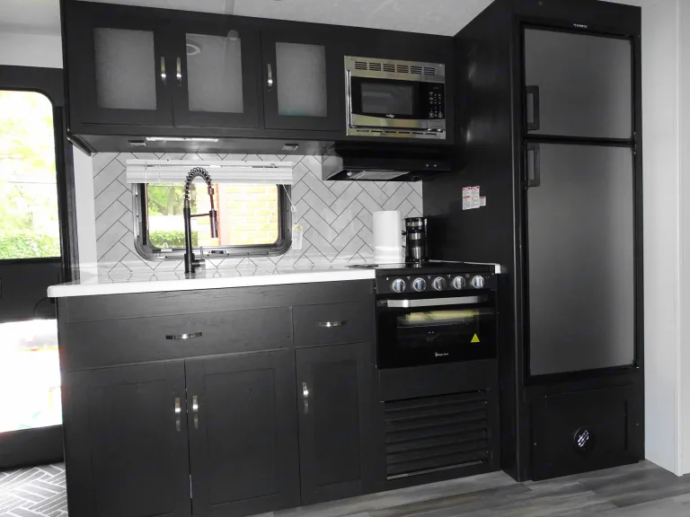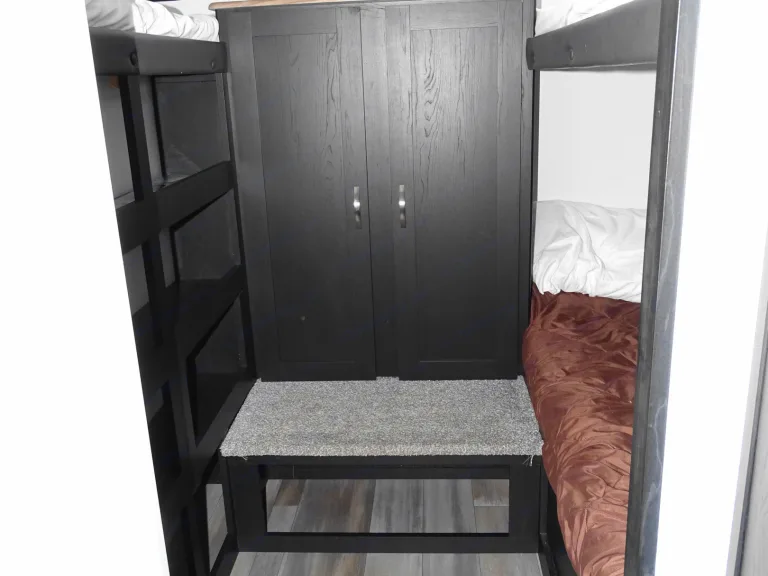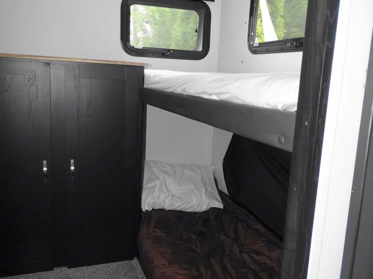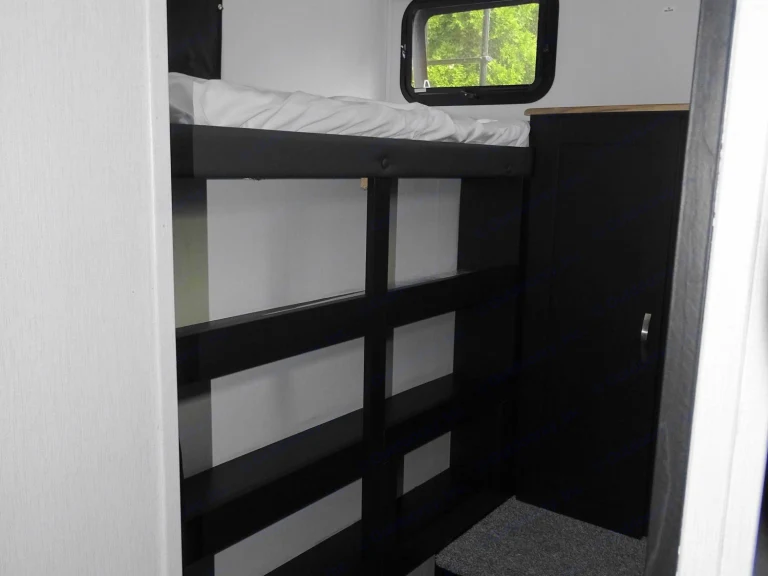 Sleeps 9 and has two bedrooms, one in the back with 3 bunkbeds and one in the front with a queen size bed to allow for some privacy. There is plenty of storage for all your needs.