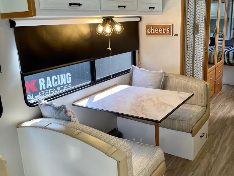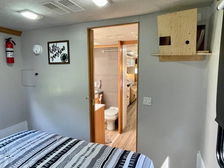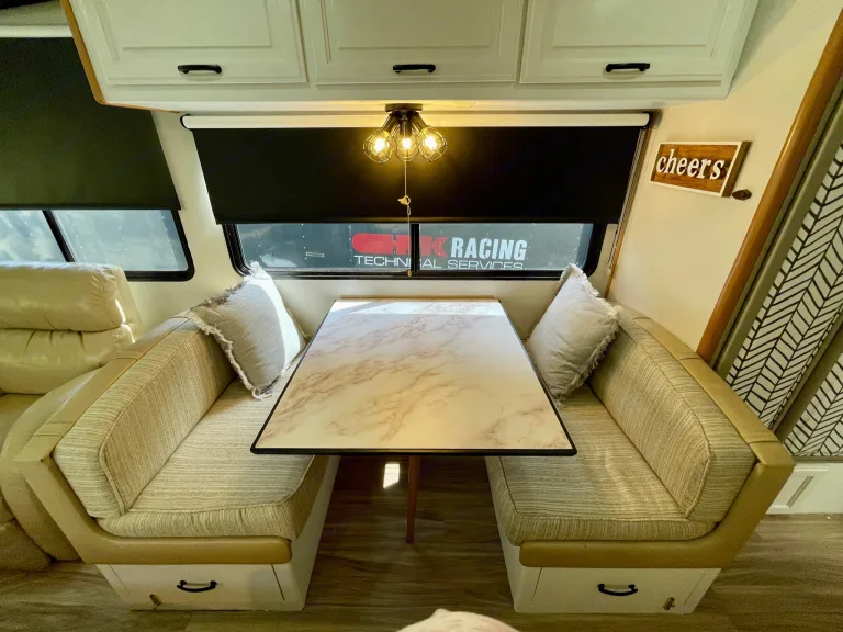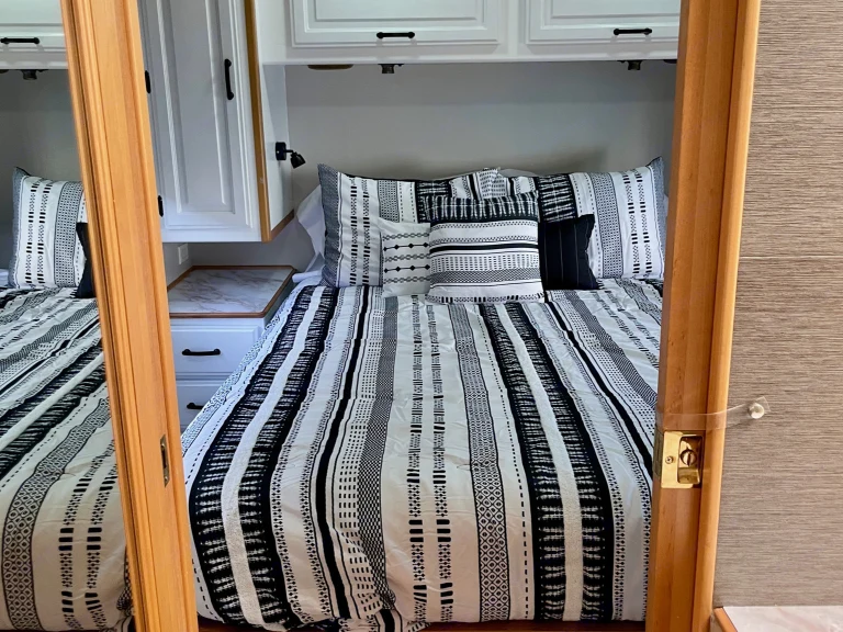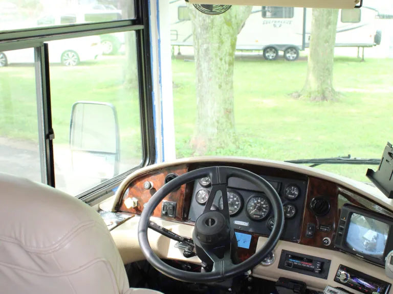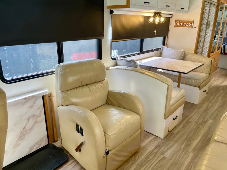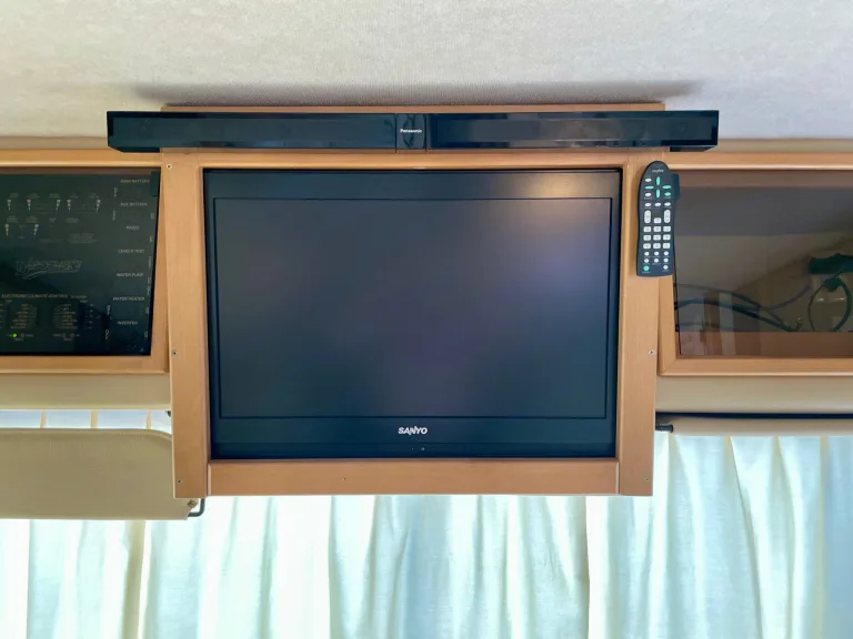 - Flat Screen TV mounted above in front of RV with a sound bar and subwoofer