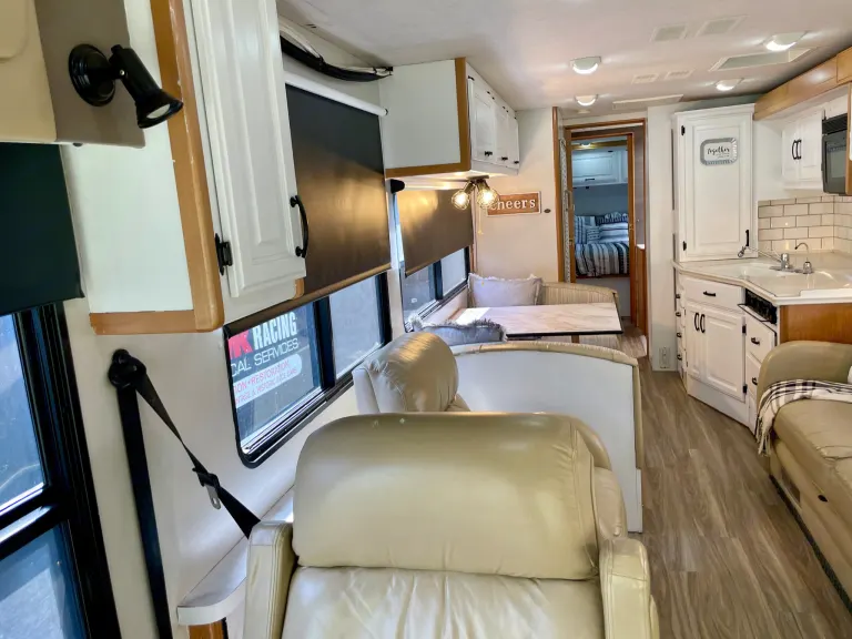 Looking for a nice Class A Diesel Pusher that is modernized? Look no further! Our Fleetwood Discovery is one of a kind! She gets decent fuel mileage on Diesel. For an extra cost, she has a Diesel Generator to run everything while on the road or where there isn't any electricity available.She can sleep 4 comfortably. The bedroom has a queen size bed and the couch turns out to what I would say is a size between a queen and full size.With her slide open, you can probably even have one or two people sleep on the floor.Our Diesel Pusher is very comfortable with it's air ride suspension and very spacious. She is a 34q model but measure almost 36'.The rig is jam-packed with everything you can need from cooking utensils, silverware, plates, k-cup coffee maker, k-cups, blankets, books, board games, and more!Leveling is easy with the hydraulic leveling system. Plenty of storage in the "basement"!