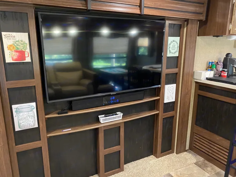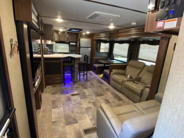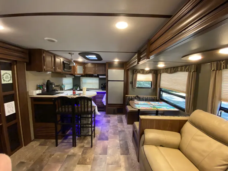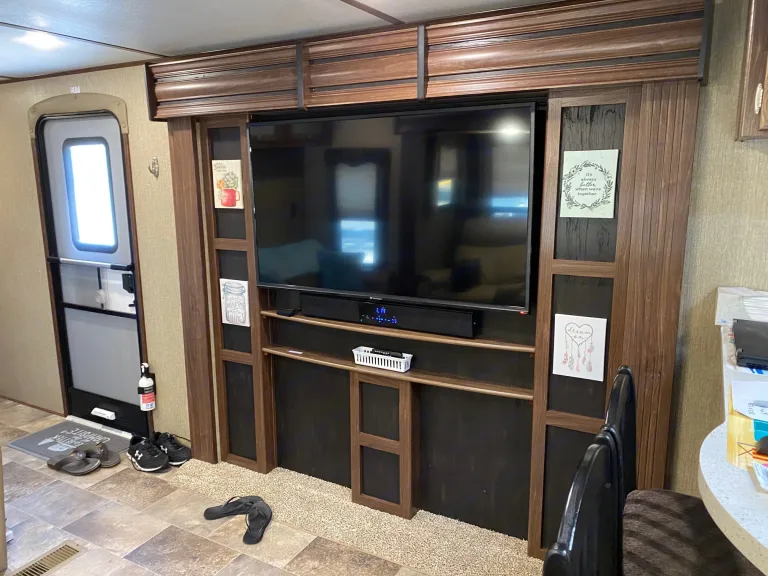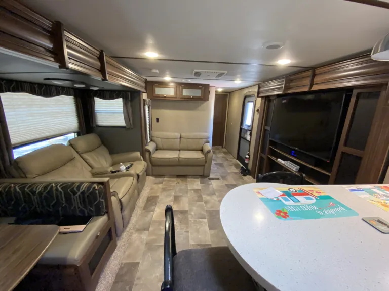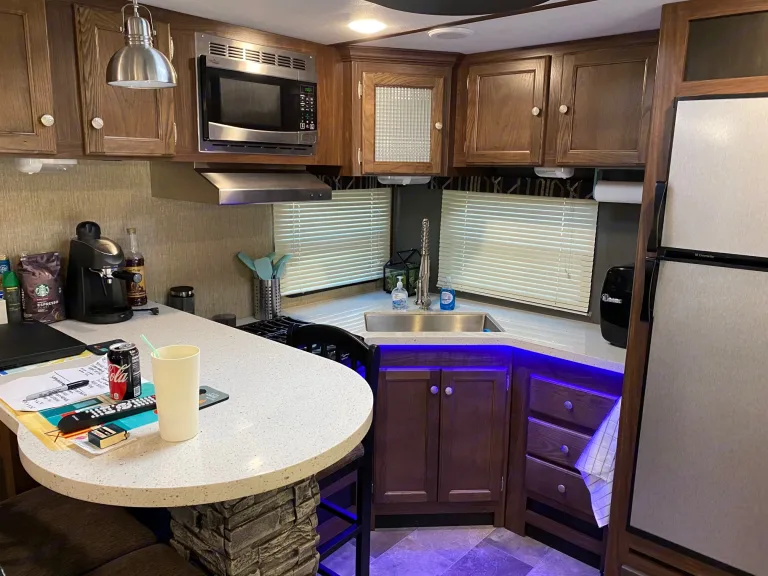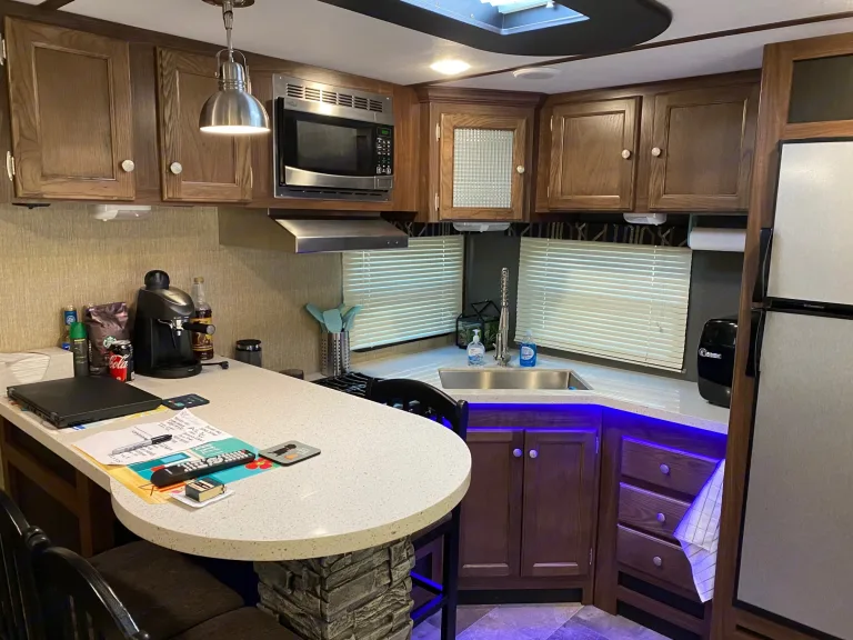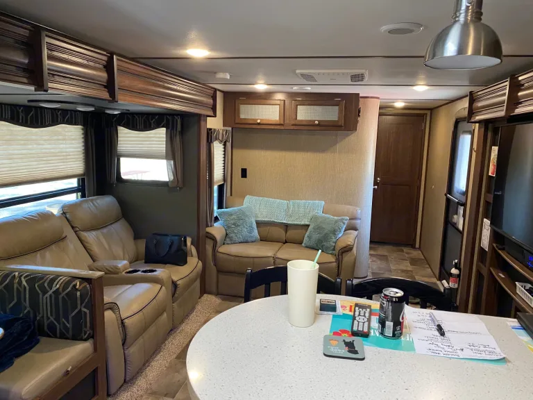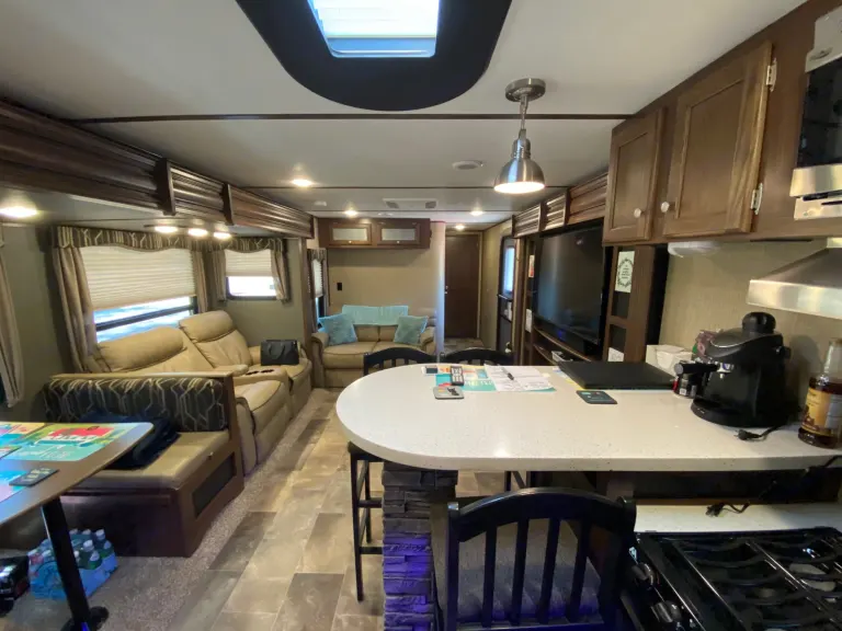 Our RV is the perfect RV for your trip! Comes with pretty much everything you need. All cooking utensils, plates, pans, etc! Inside you will find a K Cup Coffee Maker with K Cups for your morning coffee!3 slides makes it super roomy and comfortable!3 Burner Range, Stove, microwave, refrigerator and freezer.Dual propane tanks.Auto leveling system. Super easy to use!!Our RV has 3 TVs:- 55” TV inside with a speaker bar and Roku- 45” TV outside with speakers, outside kitchen with a mini fridge outside.- 32” Smart TV with Roku in the bedroomOur camper is super comfortable with two reclining and tilting theatre chairs and a sofa as well!In the hottest temperatures, our RV stays nice and cool! The AC works great and has vents that spread throughout the RV!The bed is a residential queen size bed with a new pillow topper! Super comfortable!Everything you need to setup camp!Power awning with blue LED lights.Please make sure you have the right truck to tow our trailer. It has electric brakes. It weighs 11,000 lbs according to sticker (Gvwr). The hitch weight is 915 lbs. This does not include fresh water, holding tanks, or cargo.I’m also offering delivery, setup, and a generator if need be for extra.I will go over everything with you upon pickup/ delivery, or setup.What's includedIncluded items-- Fully loaded kitchen with cooking utensils and cookware