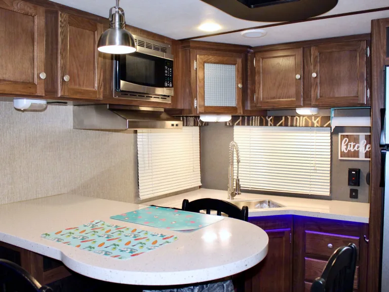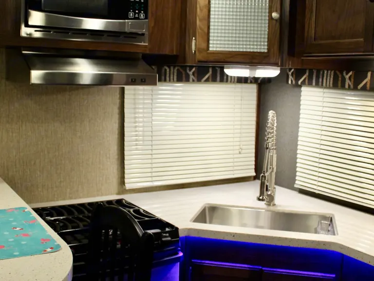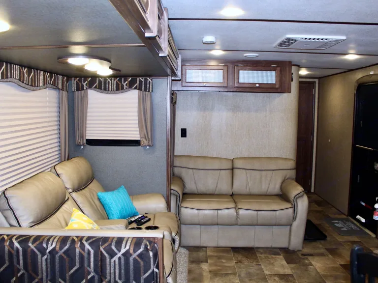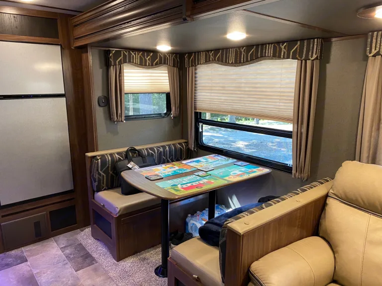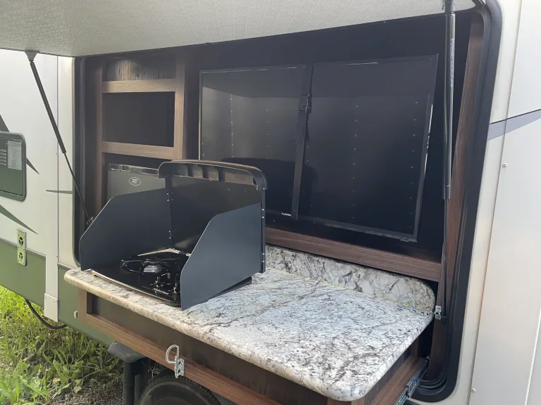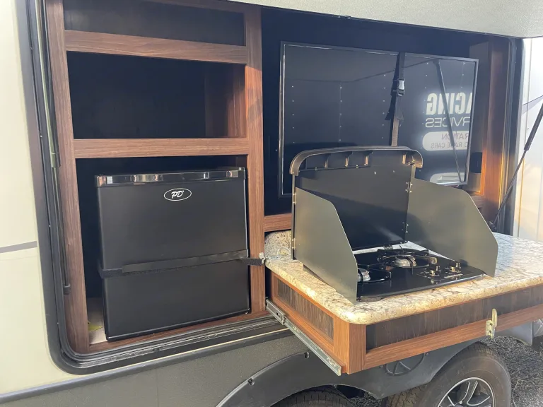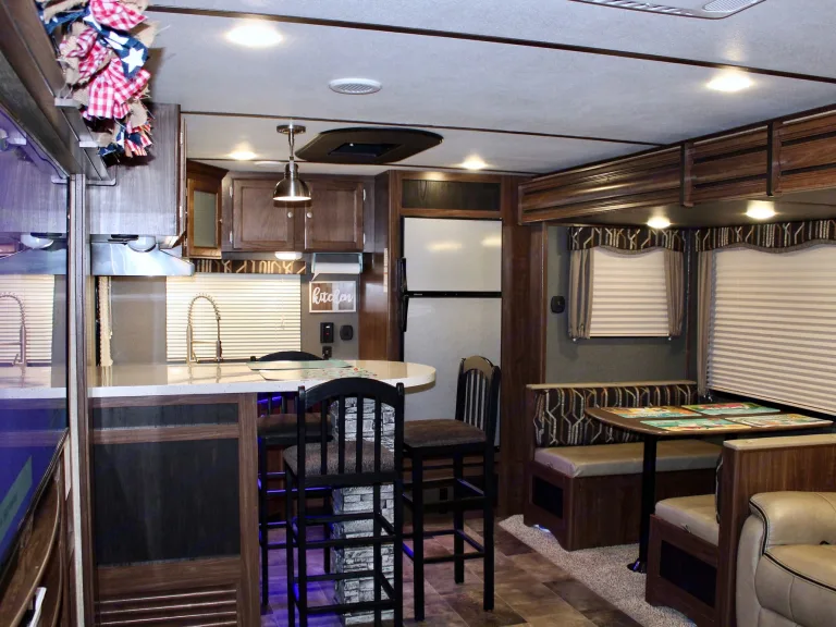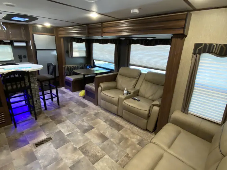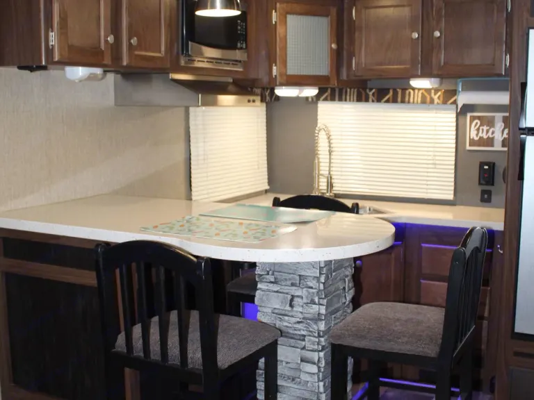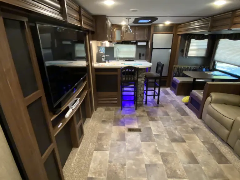 Our RV is the perfect RV for your trip! Comes with pretty much everything you need. All cooking utensils, plates, pans, etc! Inside you will find a K Cup Coffee Maker with K Cups for your morning coffee!3 slides makes it super roomy and comfortable!3 Burner Range, Stove, microwave, refrigerator and freezer.Dual propane tanks.Auto leveling system. Super easy to use!!Our RV has 3 TVs:- 55” TV inside with a speaker bar and Roku- 45” TV outside with speakers, outside kitchen with a mini fridge outside.- 32” Smart TV with Roku in the bedroomOur camper is super comfortable with two reclining and tilting theatre chairs and a sofa as well!In the hottest temperatures, our RV stays nice and cool! The AC works great and has vents that spread throughout the RV!The bed is a residential queen size bed with a new pillow topper! Super comfortable!Everything you need to setup camp!Power awning with blue LED lights.Please make sure you have the right truck to tow our trailer. It has electric brakes. It weighs 11,000 lbs according to sticker (Gvwr). The hitch weight is 915 lbs. This does not include fresh water, holding tanks, or cargo.I’m also offering delivery, setup, and a generator if need be for extra.I will go over everything with you upon pickup/ delivery, or setup.What's includedIncluded items-- Fully loaded kitchen with cooking utensils and cookware