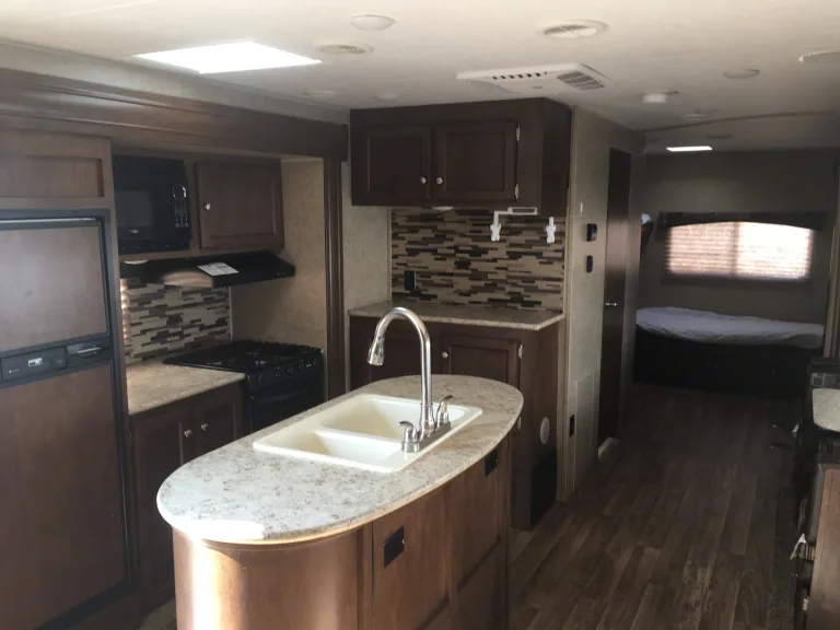 This large travel trailer needs a 3/4 ton or 1 ton to pull it. It's got 3 slides, an island in the kitchen, an outdoor kitchen, separate access to bathroom from outside. 4 bunks in the back, queen bed, a couch and dining table. Sleeps 8-10 depending on how much you like the people you're staying with. Comes with a Roku TV ready for wireless wherever you park it.