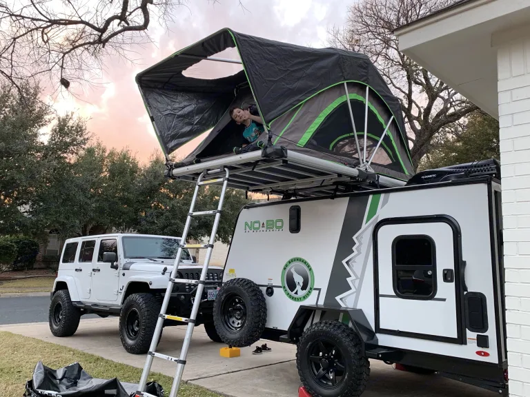 This No Boundaries trailer is ready for adventure! This trailer is light and tows great behind both our Jeeps or other small SUVs (Hey AJP people!!!;)). Equipped with a Kayak Rack, and an amazing Freespirit Recreation Roof Top Tent, its ready for your adventure! Has an A/C unit that will freeze you out, slide out kitchen with fridge/freezer and propane stove top (fridge runs while connected to your vehicle!). Our family of 5 loves how versatile this unit is for short weekend trips or a full-week at our favorite camp spot. This NoBo also has a rear toy hauler door and can bring along a small motorcycle or four-wheeler. 3-4 kids easily fit in the Roof Top Tent and love it as they think it’s the coolest fort ever! 28 inch LED TV with batwing antenna for scanning the great local HD channels. This is better than a tiny teardrop trailer, but still small enough to make towing easy! Great at San Padre Island, Hidden Falls, or the beautiful Guadalupe River!