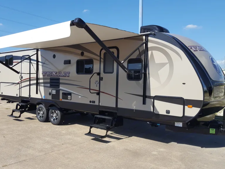 Now this is camping in style!! This 2017 Evergreen Texan 31BDS 34 foot Travel Trailer, is a fantastic way to get out and enjoy the great outdoors. She is located in the Royse City / Garland area and weighs 6800 lbs. making her towable with most half ton trucks and SUV's. She also comes stocked with our Amenities Package! Everything you need for the kitchen, bed and bath. Please note that the Amenities Package does not include cleaning. Everything needed to tow, ball, sway bar and equalizer bars are included. The 6'4" ceiling height, king slide-out in the living area as well as the slide in the bunk house make this an extremely roomy RV. She has a walk around queen bed in the master with 2 privacy doors and a swivel mount for the 40" TV which can be viewed from either the master or the living room. The dinette makes into a bed and there is also a full size pull out sofa. The rear bunkhouse features 2 bunk beds, a full size pull out sofa, entertainment area, great storage and a private door. This amazing RV can sleep 8-10 happy campers. The bath is also very roomy with a toilet, tub and enclosed shower, vanity and a separate entry door. The kitchen comes equipped with a 3 burner stove, microwave oven, conventional oven and refrigerator and freezer. The 40" LCD Flat Screen TV is complete with AM/FM/CD with Aux. input system with indoor and outdoor speakers. There's also a great power awning, power leveling jacks and an outside shower. For the chef, this RV has a great outdoor kitchen workstation with a 4 cubic foot refrigerator, bumper mount grill and sink. There are also 2 A/C units to keep it nice and cool in those summer months. The unit is also wired for cable. Whether you're camping, entertaining, attending a festival, Nascar or whatever, you will love spending time inthis RV. Every 7th night is free and monthly discounts are available as well. Rates may vary during Nascar, Formula One, some holidays and other major events. Sorry, but no pets are allowed in this RV. Please ask about insurance for this RV.