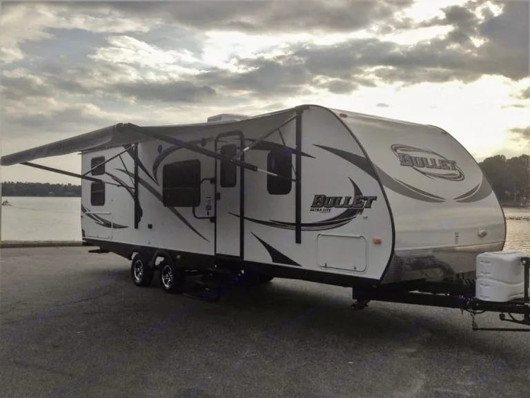 You pick the View, we'll supply the Room!Our beautiful Bullet Travel Trailer has one large slide that makes the living space extra roomy. This trailer can comfortable sleep eight adults. Both the love seat and the dinette area convert into beds that we feel work best for two children or one adult. The main bedroom has a queen-sized bed with a memory foam topper and the bunkhouse has four bunks! All sleeping areas have their own storage for all your personal items. There is an outdoor kitchen with mini fridge, 2 burner stove, and sink.