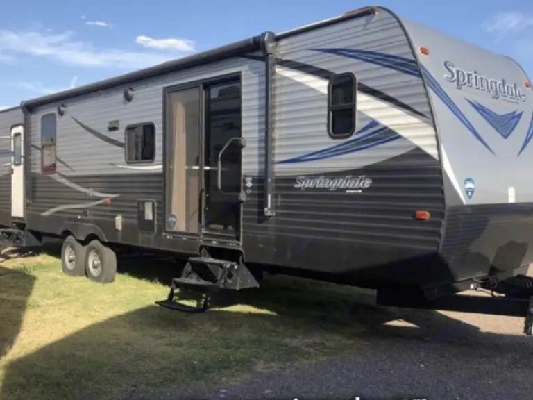2018 Keystone Springdale, 38’, 50AMP, with 2 entry doors, 2 slides (12’ kitchen and 6’ bedroom), front living room with large wrap around couch that easily makes in to an almost king size bed, electric fire place/heater and a 45” TV and stereo with in/outdoor speakers. Love seat and dinette also make into double beds.Bedroom has queen size bed with overhead storage, wardrobe closet with drawers and an entry/exit door.Ducted A/C, furnace, 3 burner gas stove top with oven, microwave, residential fridge/freezer, 2 pantry’s, gas/electric water heater, electric awning, 2 propane tanks.Hitch, sway bar and weight distribution system available.What's includedTV, linens, dishes, cookware and utensils.