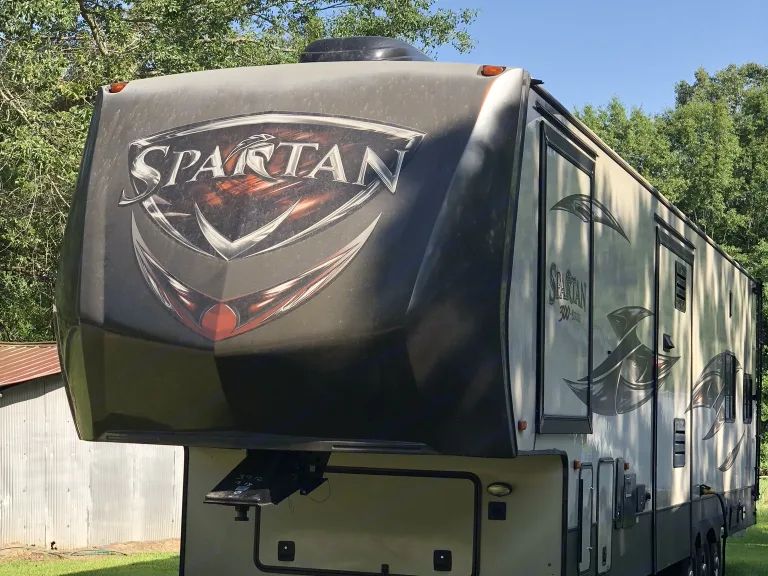 Spacious 40’ Toyhauler 5th Wheel. 8x12 garage with two queen beds and half bath. Queen bed up front and small loft above garage. Sleeps 7 with small person in loft.