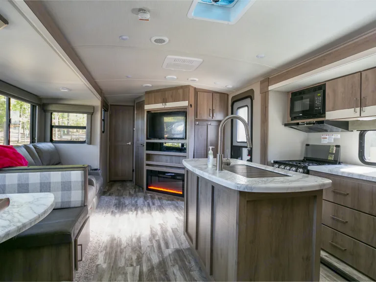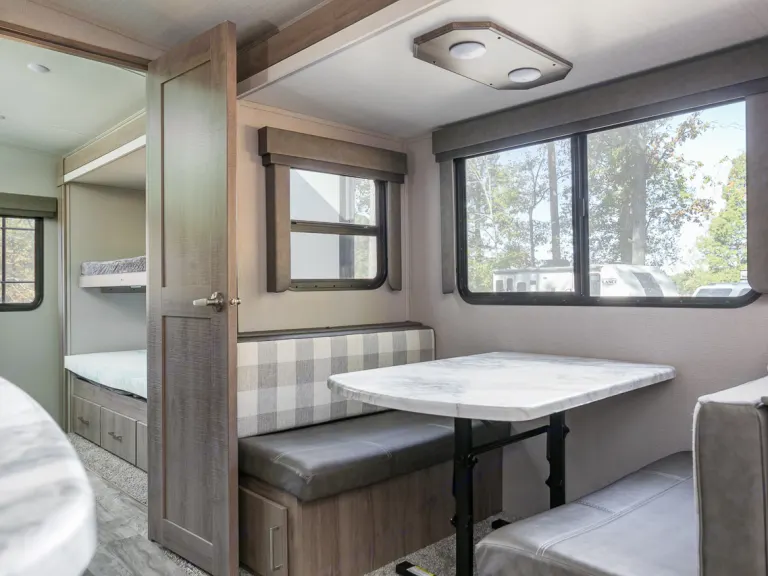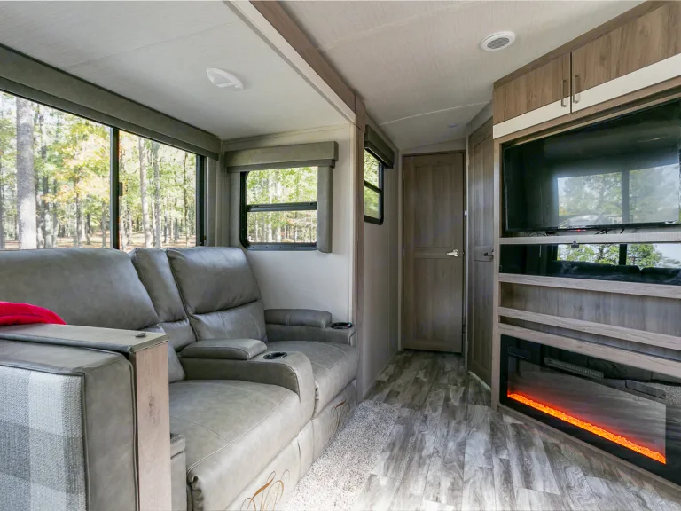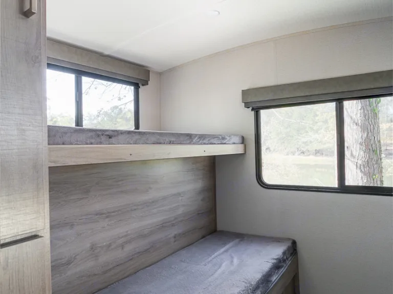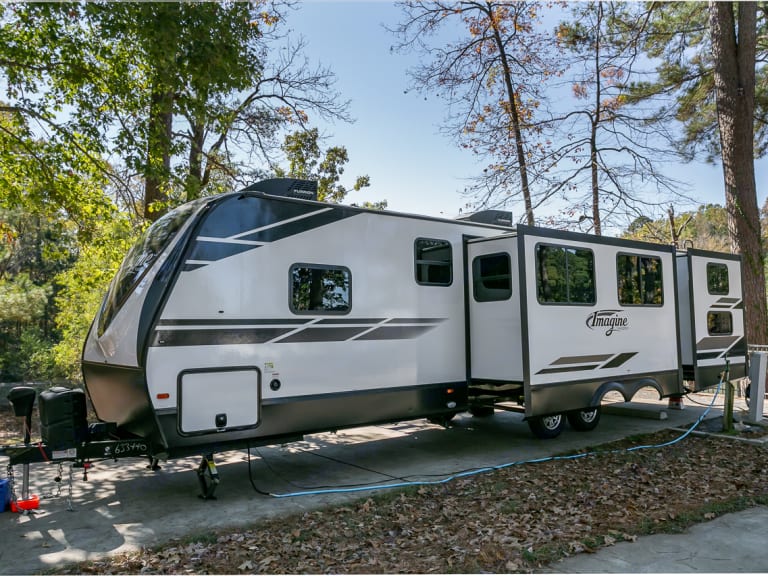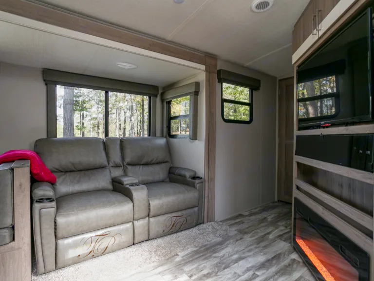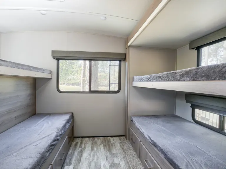 2021 Grand Design Imagine 3250BHThis is a beautiful 2021 Imagine by Grand Design. Grand Design is one of the top brands of RV with high-end finishes and all the amenities from home provided, including Free WiFi Hotspot that travels with the camper for anyone to use!This unit has two entrances. One for the living area and a second one opening into the bedroom. When you enter from the center door you will be facing two theater style recliners that offer heat and massage. They face a 42" TV that is on a swingarm, and it has a fireplace underneath.On the other side of the recliners is a free standing dinette booth. The kitchen is fully equipped and has an island offering a sink and extra prep space. There is also a large pantry closet next to the 8 cubic foot refrigerator.Going to the rear of the unit there are four bunk beds. You have two bunk beds on each side with drawers underneath. The master bedroom features a queen size bed with upgraded memory foam mattress, universal docking station and best of all its own second A/C unit.Outside you have a power tongue jack, outdoor kitchen with a mini fridge, a two burner stove, blackstone griddle, and cabinets for accessories.This camper is equipped with the 4 seasons package to ensure you're warm in the winter and cool in the summer What's includedRug