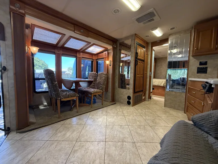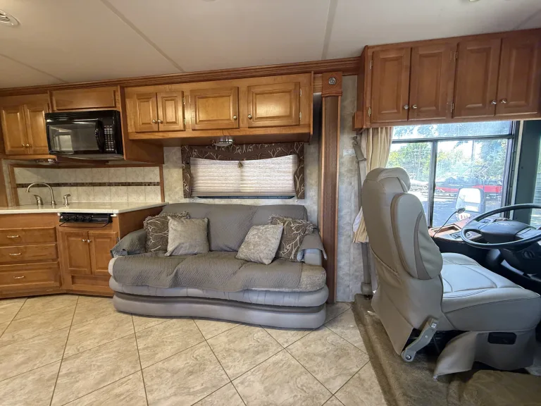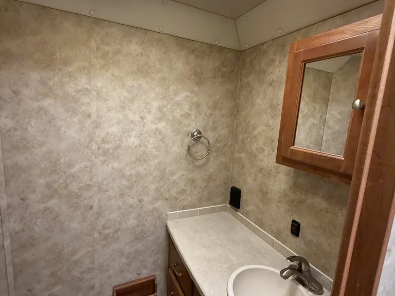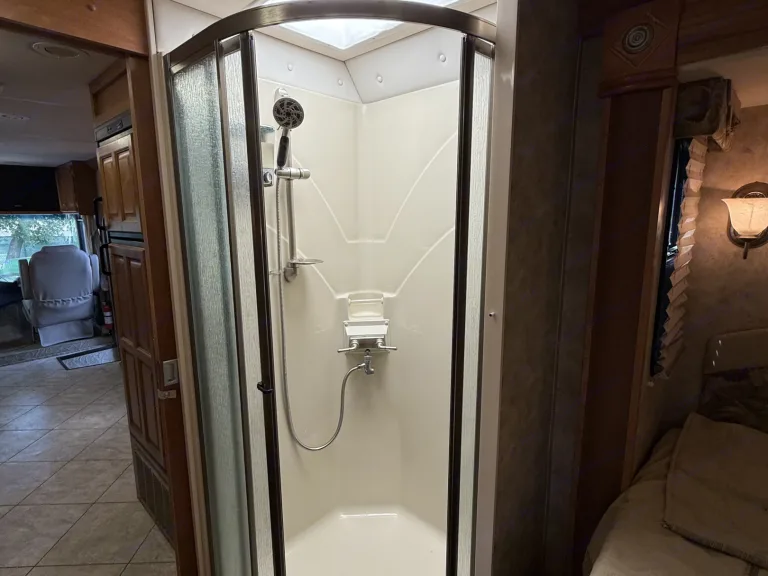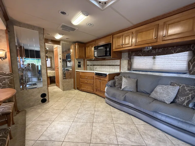 Cook on the go with a 3-burner stove, oven, microwave, double sink, and refrigerator/freezer. Plenty of counter space and cabinets for all your kitchen essentials.Full Bathroom