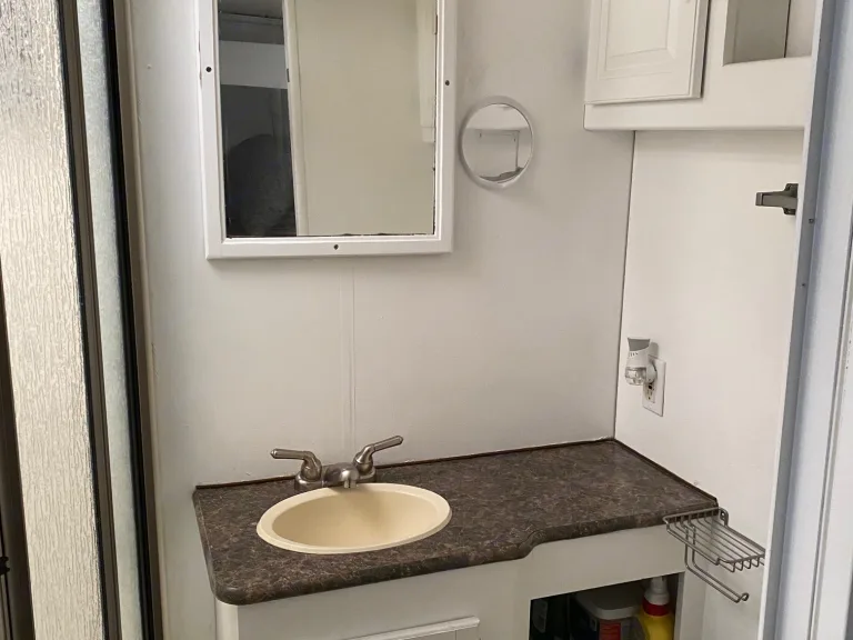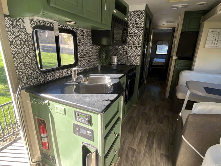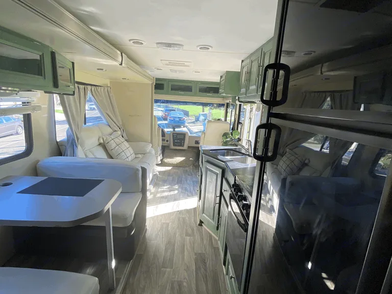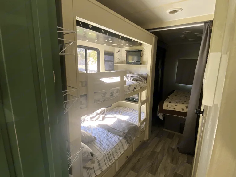 RV with Bunkbed Our 36’ RV is easy to drive and operate. This is a pet friendly, no smoking, family friendly RV. Its Ford Triton V-10 gas engine runs on 87 octane, is well maintained. This motorhome is fully stocked with linens and towels, pillows and blankets, dishes, and silverware, for four people. Two children can sleep in the bunkbed or one teenager can sleep comfortably on the dining table that converts to a bed. There is also a Queen bed in the spacious rear bedroom that has a slide out for easy access around the entire bed.