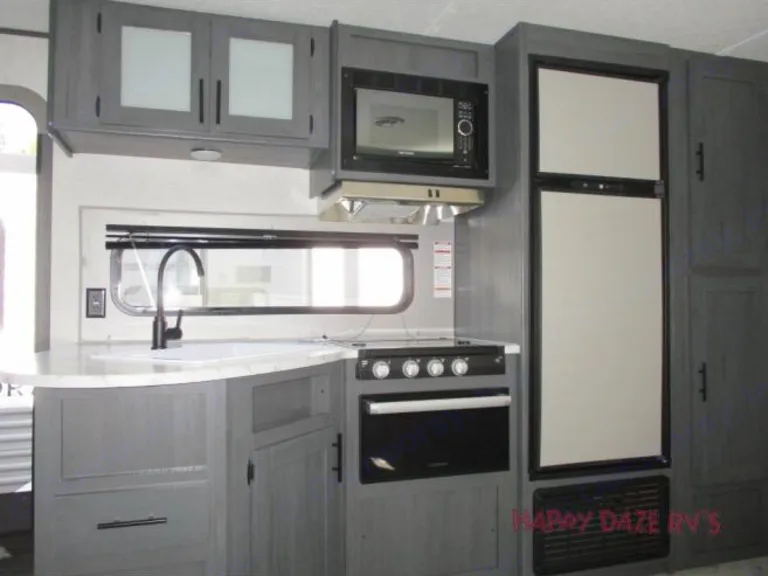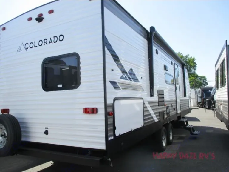 Outside KitchenStorage is no issue with this trailer thanks to the entry closet, the pantry behind the hinged entertainment center, the extra wardrobe next to the double size bunks, all the bedroom storage including drawers, and the exterior pass-through storage for those larger items. You and your family can sleep eight to ten people with the queen bed, the bunks and the furniture within the large slide out that doubles as sleeping space for more friends and family. Everyone will appreciate the convenience of having a full bathroom especially at night. And the cook will have full kitchen amenities inside, and an outside kitchen as well.With any Colorado travel trailer by Dutchmen, you get more standard features giving you more value for your money! The interior offers upgraded residential flooring for durability, blackout night shades throughout for privacy, over sized windows for great views when inside, and full extension drawer guides throughout. Each Colorado comes standard with the Dutchmen construction advantage including the Blade air flow system which is designed to reduce air turbulence and noise accelerating airflow. Other highlights include a power tongue jack, power stabilizer jacks, a high output furnace, and solar prep. Make your selection today!Options:
