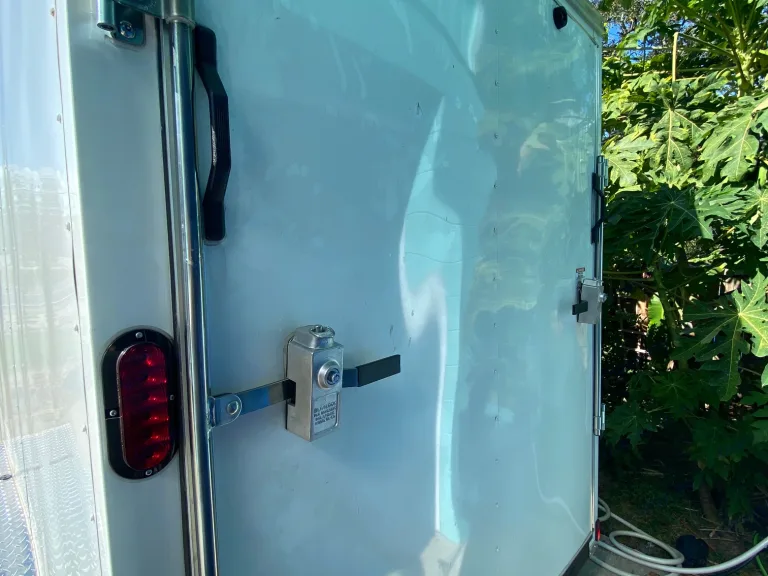 6 (w) X 7 (h) X 14 (l) enclosed trailer. Used for hauling only. Nothing inside the trailer. Has one side door and one rear ramp for ease of loading.