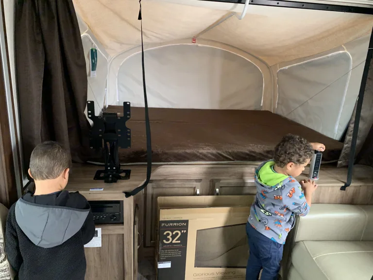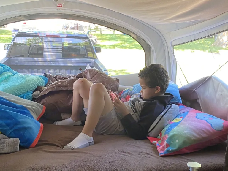 Child relaxing in an RV rental pop-up camper, playing a handheld game. A truck and outdoor scenery are visible outside.. Jayco Jay Feather 2020