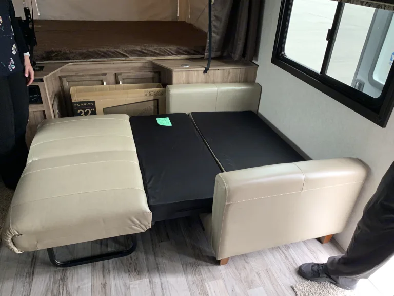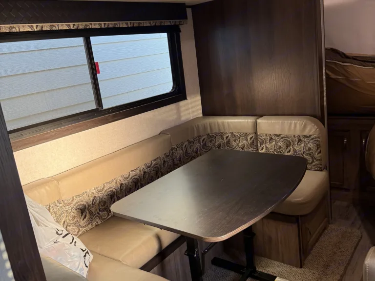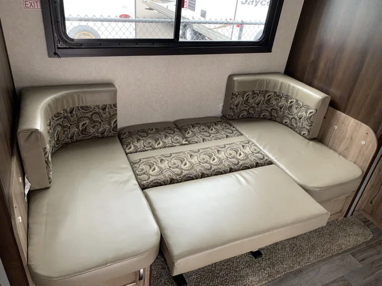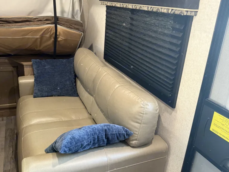Cozy RV rental interior with a tan sofa, blue pillows, window blinds, and bunk bed. Perfect for a road trip!. Jayco Jay Feather 2020