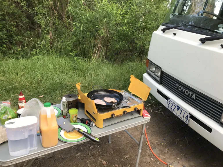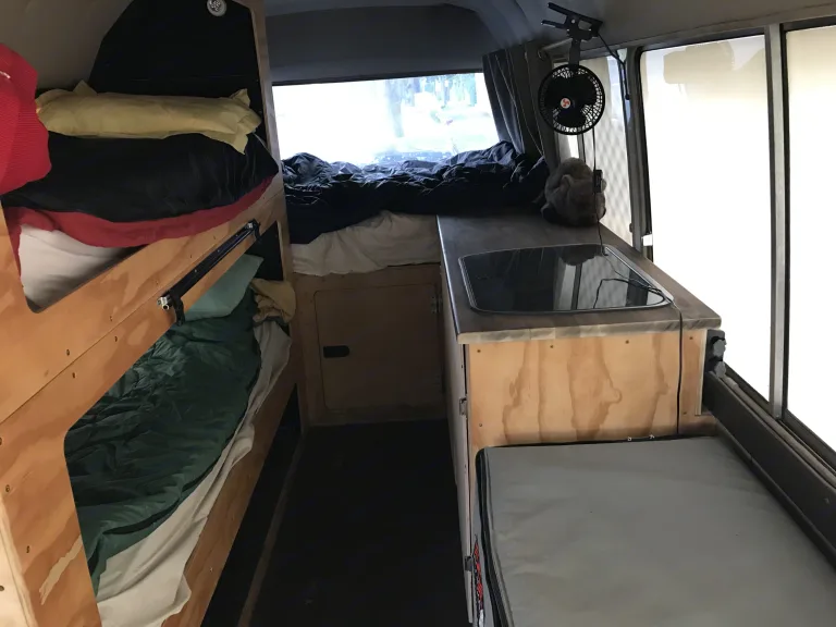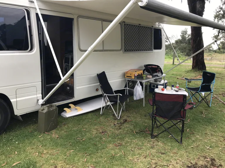 comfortable Toyota Coaster motorhome with roll out Awrning , 5 seats with seat belts , sleeps 4 , Gas hot water , Shower tent , toilet , sink , outdoor tables , Zigler and Brown BBQ , Gas cooker , open fire hotplate and grill , cooking gear , cutlery , crockery