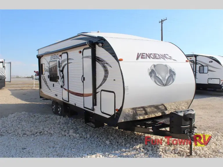 It’s a toy Hauler so you have the ability to take the toys with you. Also it has a tankless hot water heater, a standard refrigerator a king sized bed in the master.