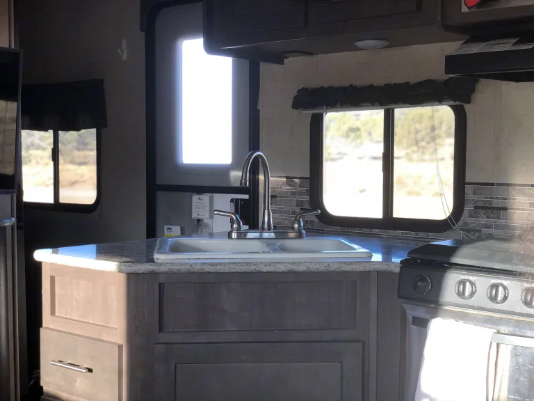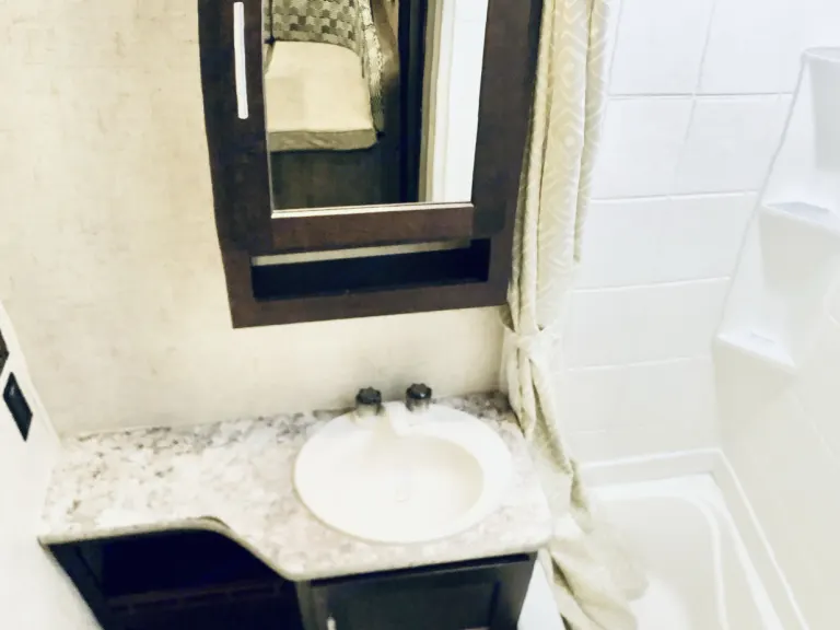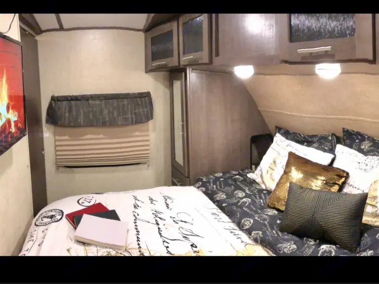 The kitchen is loaded with all the cookware and dining-ware you will need. It has a 3-burner stove, microwave, freezer, refrigerator, pantry, and ample countertop space. The living space of the main room has a large slide out that makes the trailer feel open and comfortable. Containing a large u-shaped dining table and couch. There’s also a 48” smart TV that can be viewed from anywhere in the living space.