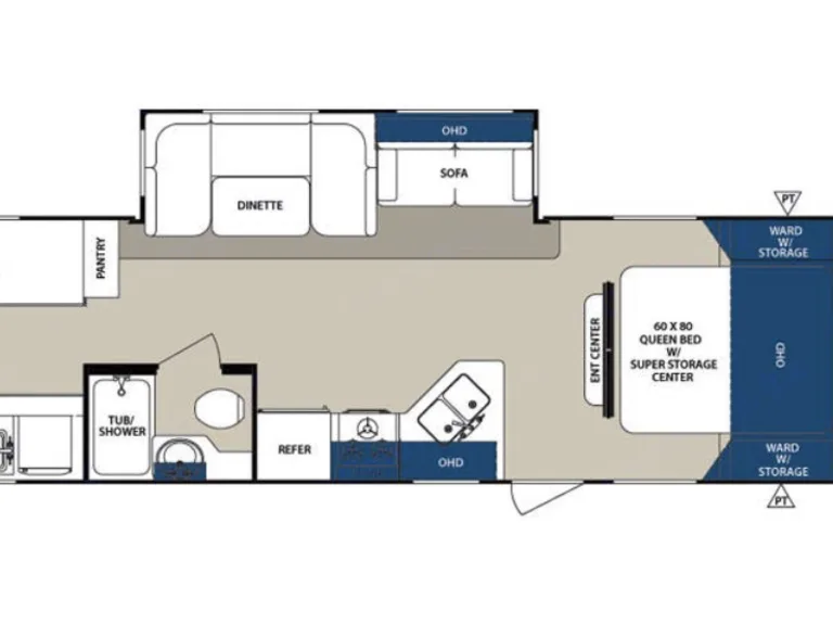 This unique trailer is designed with the bunkhouse on the opposite end of the master bedroom, allowing for some separation of sound between you and the kids. The bedroom has two sets of bunkbeds (4 beds in total). Between the bunkbeds, are cabinets and drawers for your family’s wardrobe as well.
