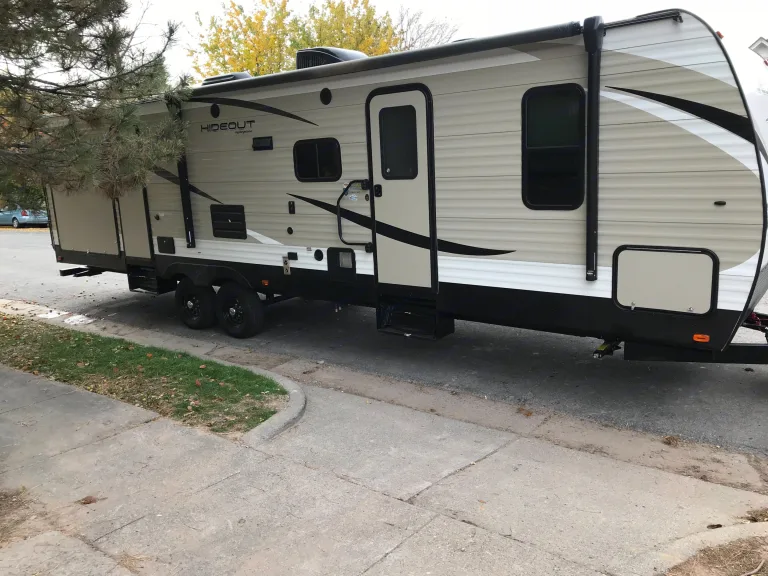 2018 Hideout 31Bhdswe that is in exceptional condition with two slideouts, one in the rear bedroom and one for the dining/living room. Queen size master bed, couch pulls out to sleep two, dinette sleeps two, and four can sleep in the back. Bathroom has a separate entrance that cuts down on traffic through main trailer. There is a shower in the bathtub. Front slide out contains dining area and leather loveseat. TV rotates to face master bedroom or kitchen. Sound system plays on two areas, inside or inside/outside. There is an external kitchen with an additional refrigerator. Outdoor shower as well. Awning is power operated and has built in LED lights. Trailer has the cold weather package which is an insulated bottom with water pipes running in the heat vents to prevent freezing. A/C and heat work great. I have sewage hose, 50’ of potable water hose, in-line water pressure reducer, in line filter, power surge protector, and two 25’ plug in cords. This trailer easily sleeps 10+ people.