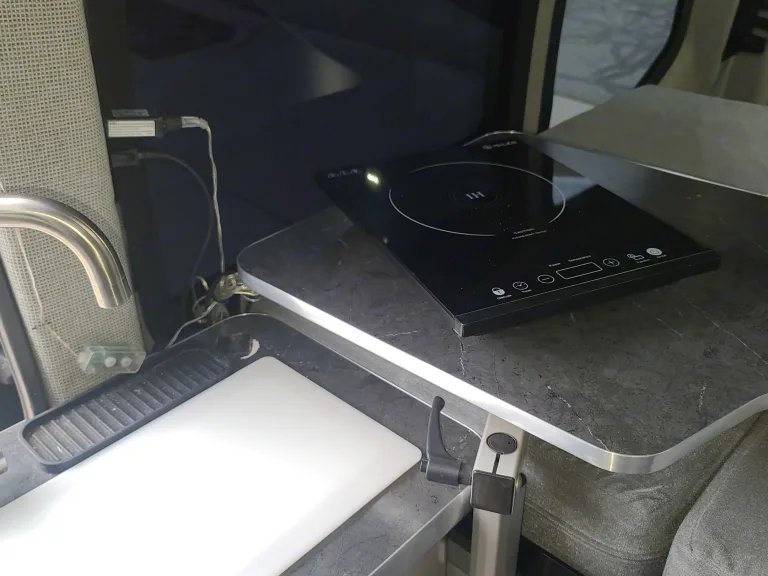 The accessories for meals (dinette, microwave, kettle and induction hob) or the toilet (Dry Flush toilet, shower) are sufficient. We just added a toaster for our gourmet mornings.
