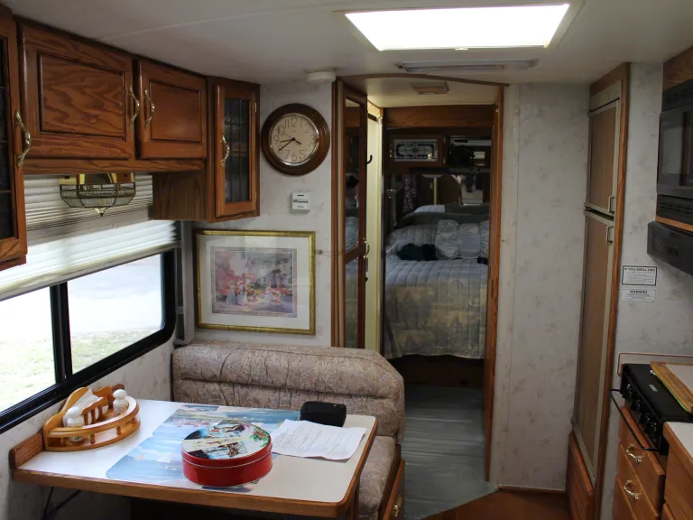 Super clean, no sliders to deal with, comfortable queen bed with large TV in bedroom, portable TV for the front which can go outside if need be. Two Air conditioners, generator, couch makes bed, and breakdown dining area makes bed. awnings, and plenty of storage areas.