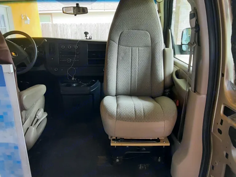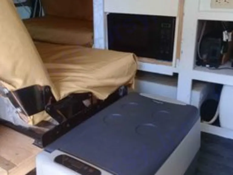 kitchen window with bug filter, roof ventilation fan with bug filter, DC charge isolator from engine to home battery, 180 degree passenger seat swivel chair.