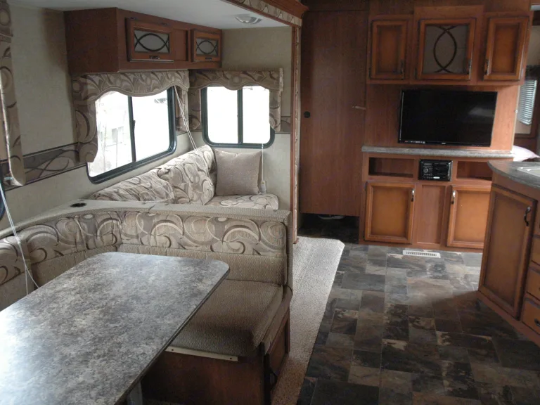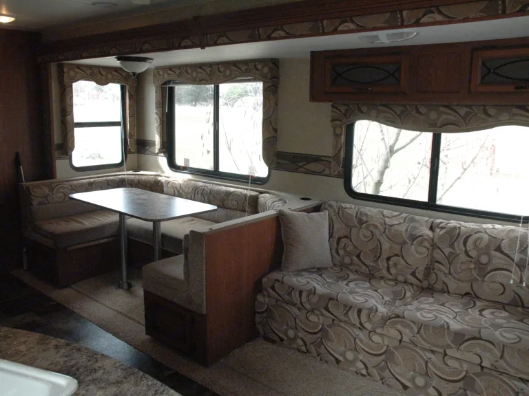 The u-shaped dinette can be made into a spacious sleeping space and the couch can convert to sleep space as well.
