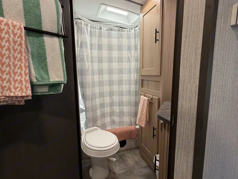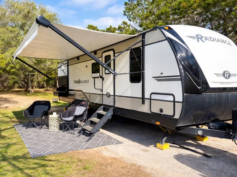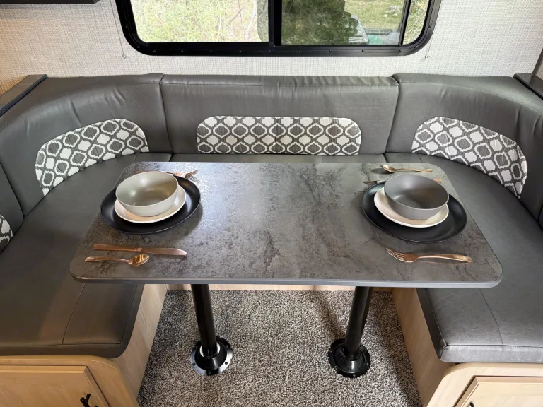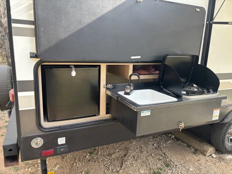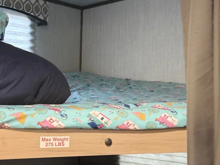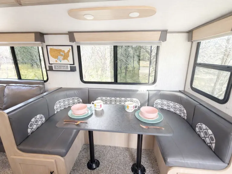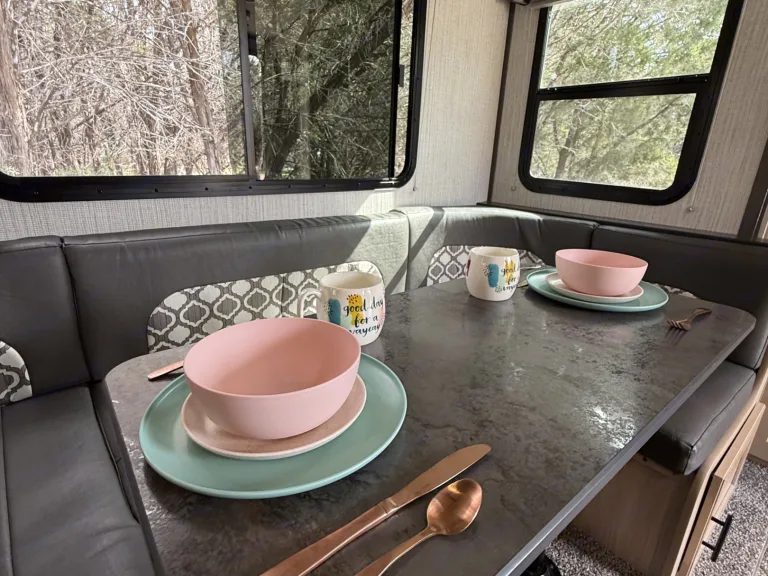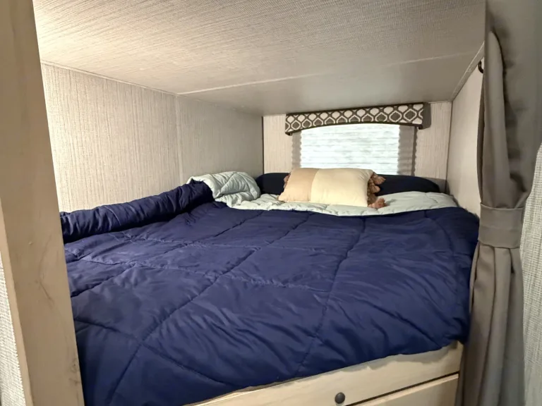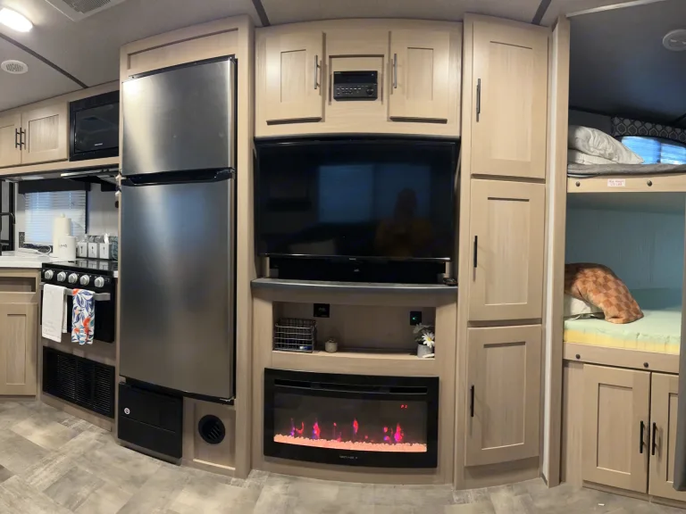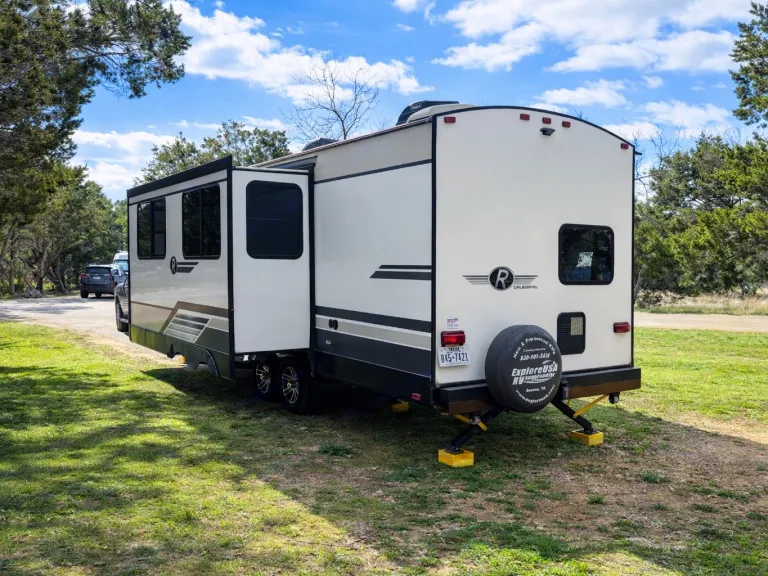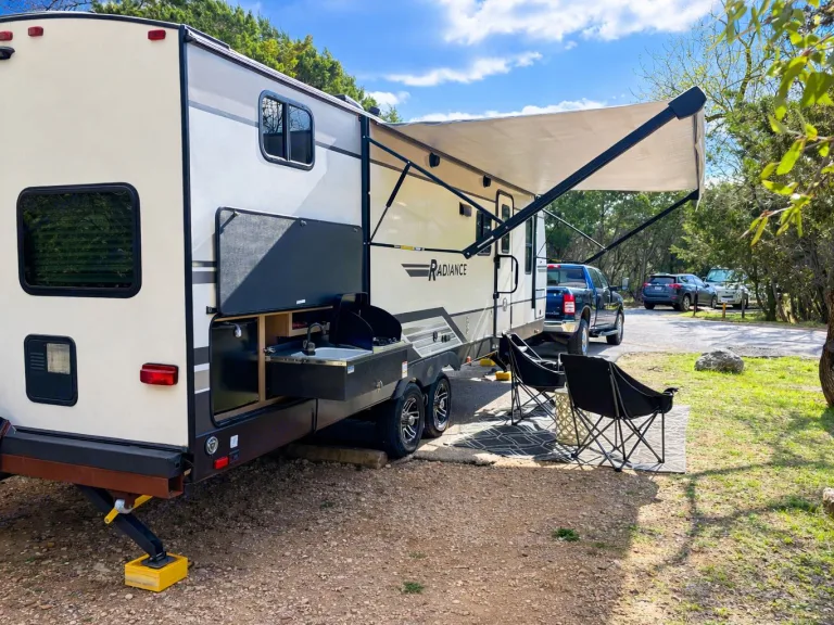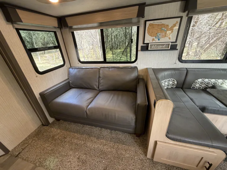 Spacious bunkhouse camper with king bed, full bunks, and delivery with full setup available for easy, stress-free Hill Country getaways.This comfortable travel trailer is designed for convenience and memory-making escapes. Inside, you’ll find a king bed for the adults, full-size bunk beds for kids or additional guests, plus extra sleeping space from the convertible sofa and dinette.The camper is fully stocked so you can arrive and relax right away. The kitchen includes cookware, dishes, utensils, coffee supplies, and everything needed to prepare meals. Enjoy indoor cooking with the stove and oven, or use the outdoor kitchen for that classic camping experience.There is generous storage throughout for your belongings, along with a TV and Bluetooth audio system for entertainment inside and outside. Outdoor speakers make it easy to enjoy music while you cook, relax, or gather around the fire.Linens, towels, and starter supplies are provided. Just bring groceries, clothing, and personal items.Ideal for families, couples, or small groups looking for a clean, comfortable home base with the added convenience of delivery and setup available at many locations.What's includedFully stocked kitchen with cookware, utensils, plates, coffee maker with starter pods, toaster, and basic spices. Towels, RV-safe toilet paper, travel-size toiletries, and hair dryer included. Outdoor chairs provided. Surge protector and upgraded water filtration system included. First aid kit, fire extinguisher, cleaning supplies, broom, vacuum, mop, flashlights, universal charging cord, plus kids’ coloring books and card game.RecommendationsSome of Finn and my favorite spots include mornings by the Guadalupe River, lake days at Inks Lake, dancing at Garner State Park, and exploring Pedernales Falls. We also love Lantern Oaks RV Resort, Jellystone Park Guadalupe River, and events at The National Shooting Complex. Delivery with full setup is available at many locations — arrive to a ready campsite and simply enjoy your getaway.Other things to notePlease no smoking inside the camper.Pets are welcome with prior approval. Just let me know in advance if you plan to bring one.Before checkout, please place trash in the appropriate bins, wash any used dishes, and remove personal food items from the refrigerator and freezer.If the holding tanks are not emptied prior to return (for towable rentals), a dump fee will apply.Most important rule: Have fun, relax, and make great memories.