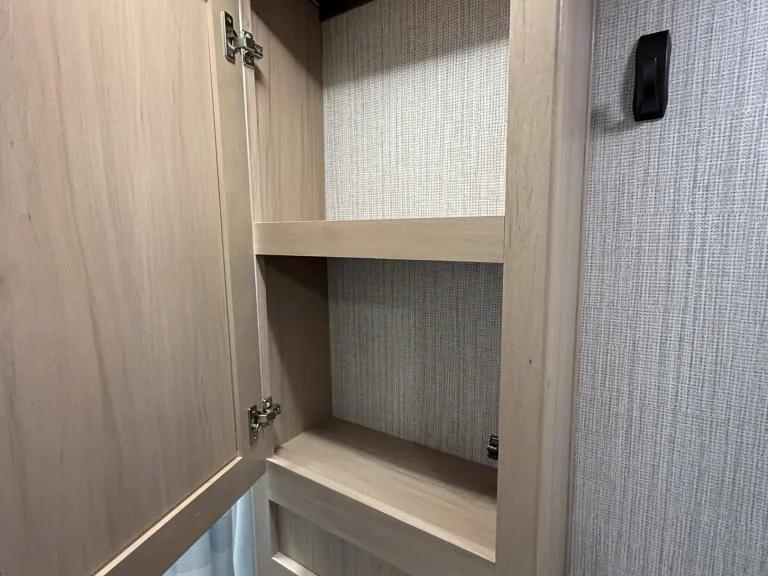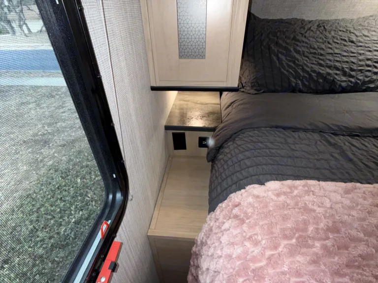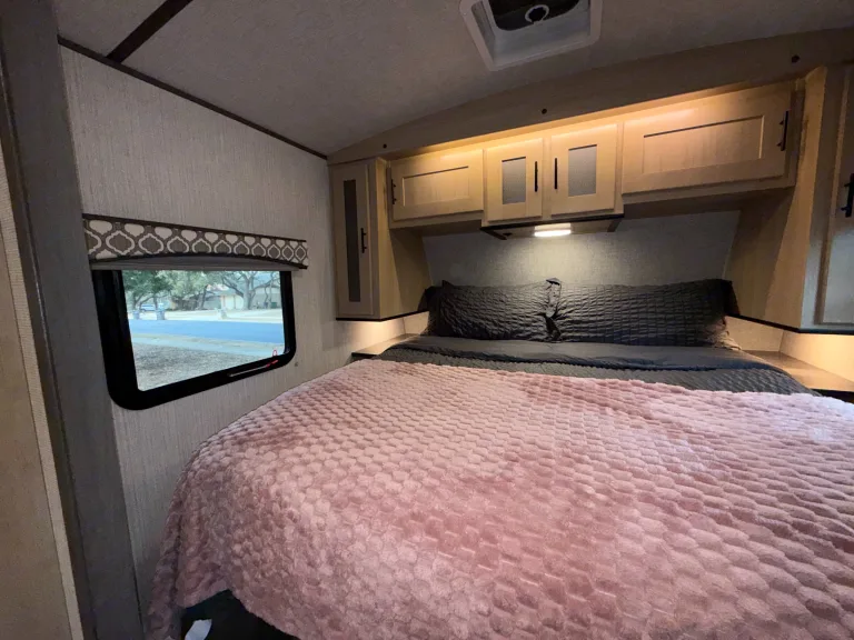 Cozy rv rental bedroom interior features light wood cabinets, a plush pink blanket, and a window with an outdoor view.. Cruiser RV Radiance Ultra Lite 2020