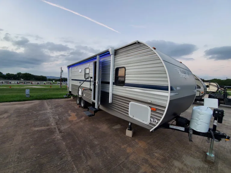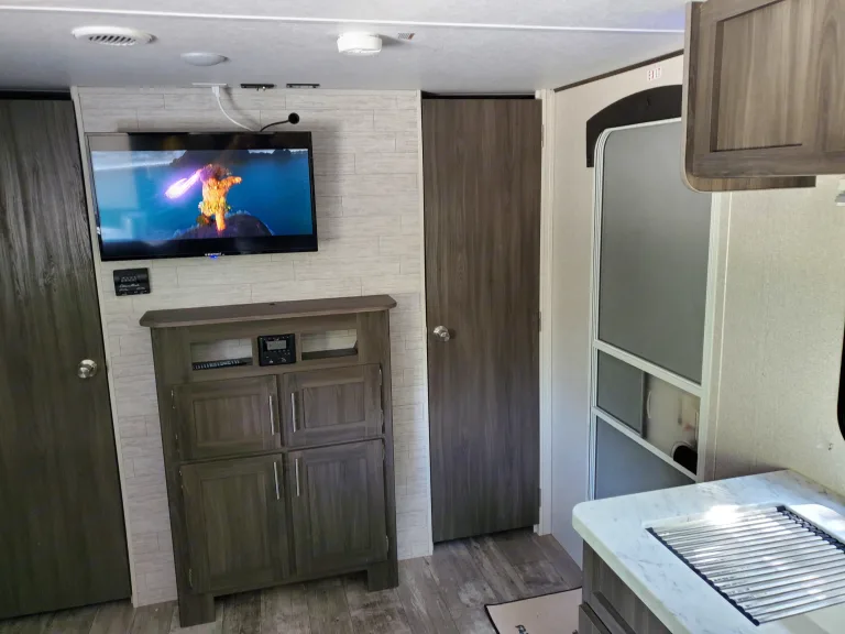Our RV is a home away from home for the family that seeks adventure. It has 1 bathroom with shower, sink and toilet. The bathroom also has a door to the outside for quick access. It has a 3 burner cooktop with and oven, microwave, and vent hood. It has a 10 cubic inch fridge with freezer. Dining room and sofa both fold out for extra sleeping spaces and slide out for plenty of room inside. 2 double size bunks for the kids or big kids! Also has a separate queen size bed in a private bedroom with door access from both sides. 32" TV in the living room and in the bedroom. It also has a 20' awning in the front for optimal shade with speakers connected to a Bluetooth receiver inside. There is also an outdoor shower with hot and cold water. Keurig coffee pot included.What's includedYou'll have all you need for full hook ups. Sewer, electrical, and water. There's a filter for the water. Also comes with a gray water transfer tank, if there is no sewer connections. Also has all you need to level the rig. Pots, pans, utensils, plates, cups, and a electric skillet is all in there. All you should need is blankets, pillows, and towels.