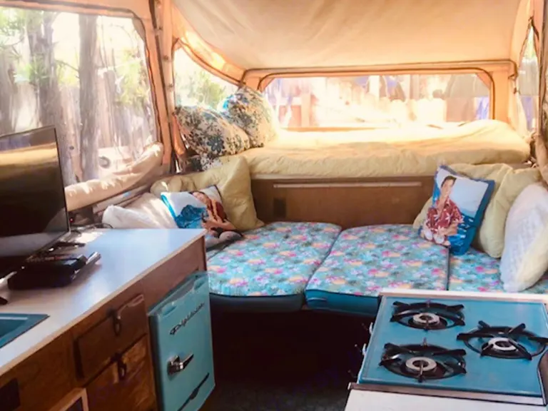 Rent the ultimate beach camper: the "Blue Hawaiian!" Vintage aloha charm with full glamping functionality. Perfect for family or friends. Camping or day is pop up camper is only available for pre-setup and pickup at Doheny, San Onofre bluff, San Mateo, or San Clemente State Park. Roomy and comfy for 6 but best suited for 2 adults and 4 or less children, or 4 adults. You can bring a tent for added room. Small fridge, TV, DVD player, sm. space heater, and toaster oven/ coffee pot works with hookups or generator. Generator available upon request. Our kids hook up their gaming Switch and PS4 just fine. Stove works on propane and instant coffee is provided, so you can make coffee with kettle without hookups or generator. Lights are battery operated. Generator rental optional; local campsites allow generator 10 am-8pm. EZup awning for picnic table included. Miscellaneous tableware, wipes, and other fun stuff included. Linens and pillows included. Our little playhouse/beach rig is super fun for family and friends- you will love it! Camp ground check in time is 2pm, so it will be available at 3 pm. We will meet you and walk you thru how to be comfortable and have fun and how everything works. Thanks! Cecily and Scott Jones