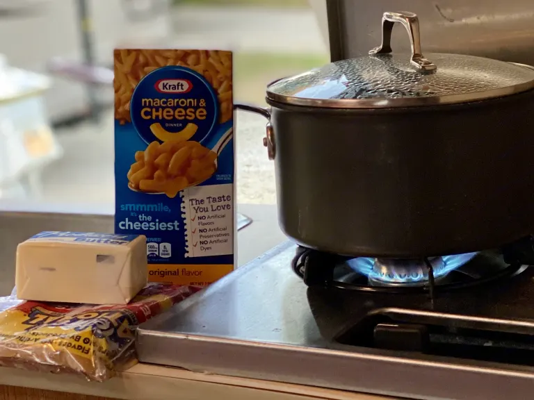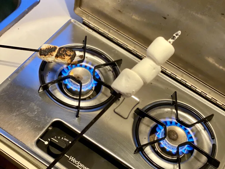> Propane-powered stove & fridge for added convenience.