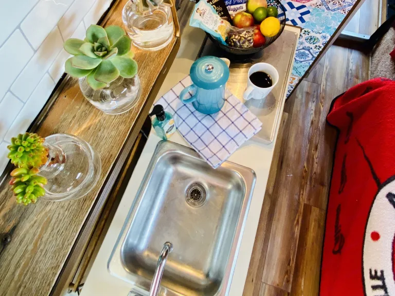 > Utensils, bowls, plates, cups & cookware includedMore InfoWhile the Van House is the perfect option for both traditional campgrounds and RV parks, the following amenities require electrical + water hook-up OR generator: sink, toilet, tv, microwave, electrical outlets, overhead lights, fan.3 hours of generator use / day is included.Sorry, no exceptions to the NO Pets policy.More fun pics on Instagram @sdvanhouse