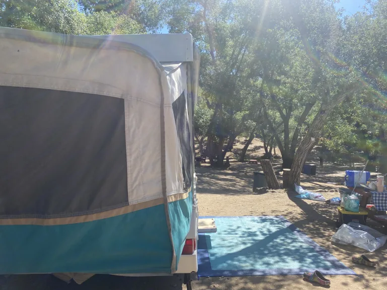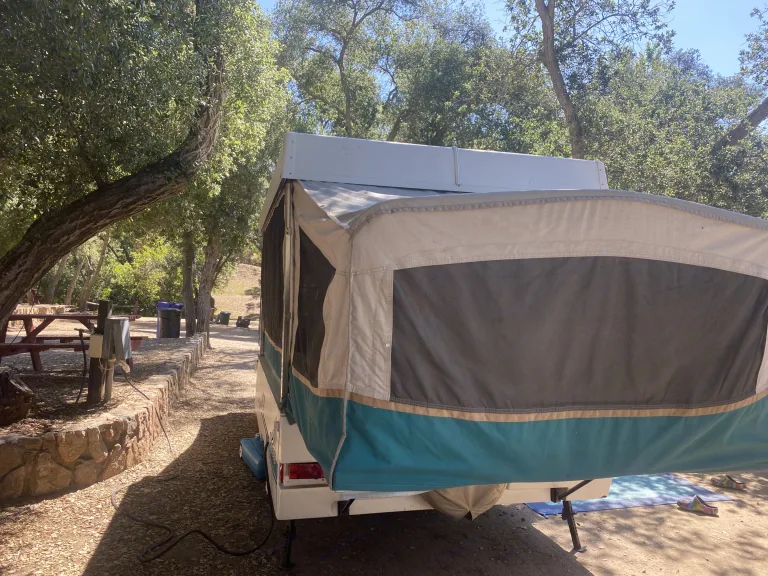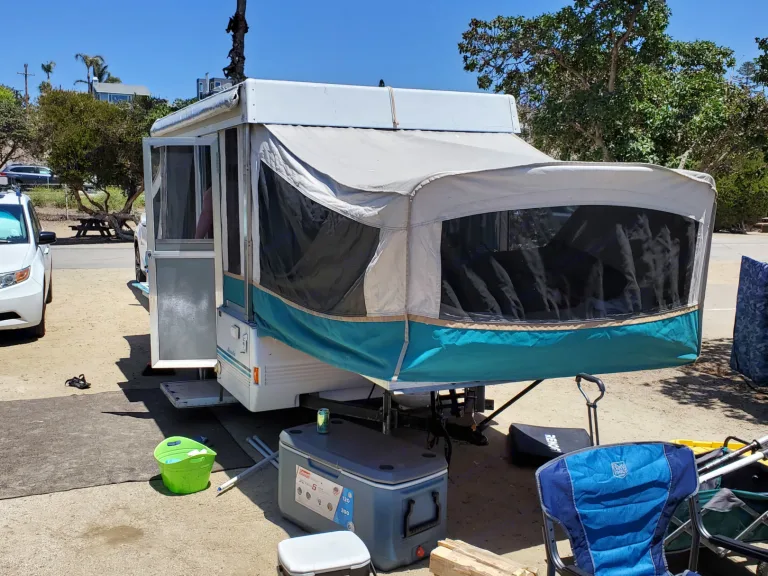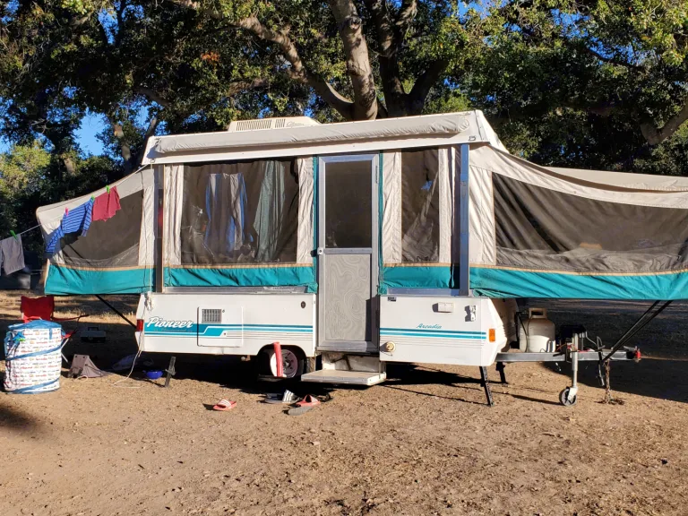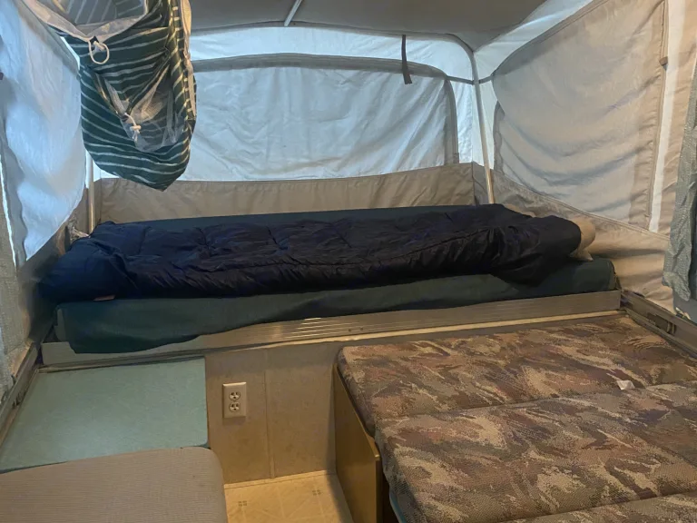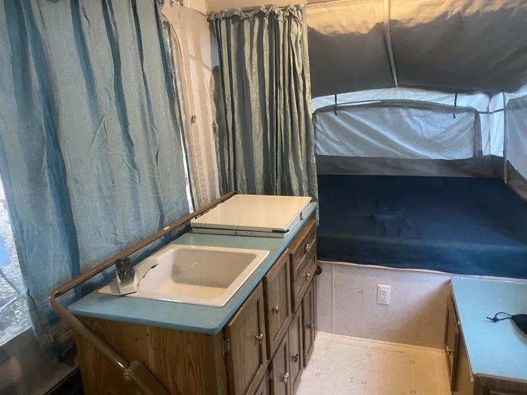 Light weight easy to tow with a SUV or Minivan. Sleeps up to 5 adults. Queen bed on one end, full size bed on other end and dinette folds into a large twin size bed. All beds have a 3 inch foam mattress which are comfortable to sleep on. Two cooking stoves, one inside and one that attaches to the exterior. There is a awning attached to the exterior that is easy to set up, or you can rent our pop up shade as an add on. The canvas easily unzips with a screen to allow fresh air or you can use the maxxair fan will keep you extra comfortable on warm nights.