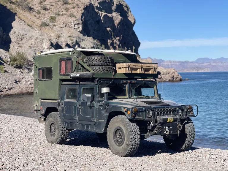 Rugged and Refined Hummer H1 custom Overlander professionally built to travel off road and the world class trails and most beautiful beaches of the Baja Peninsula. Fitted with all the equipment needed to be comfortably off the grid for days. Sleeps a family of 4 - two adults and two kids. Seats four with seatbelts. Fitted with state of the art dry flush toilet, vehicle and camper A/C, hot water outdoor shower, running water sink, solar power system and recovery equipment.