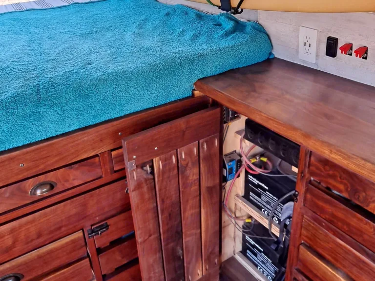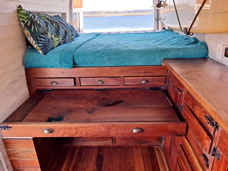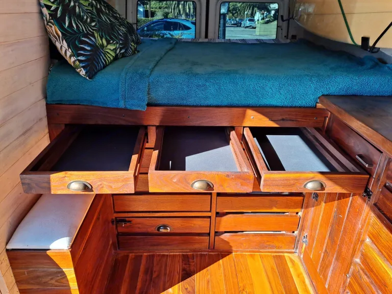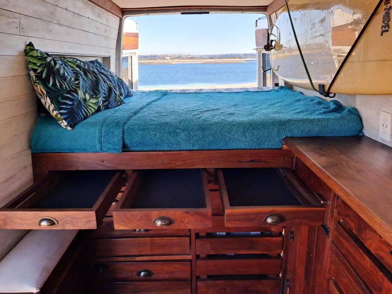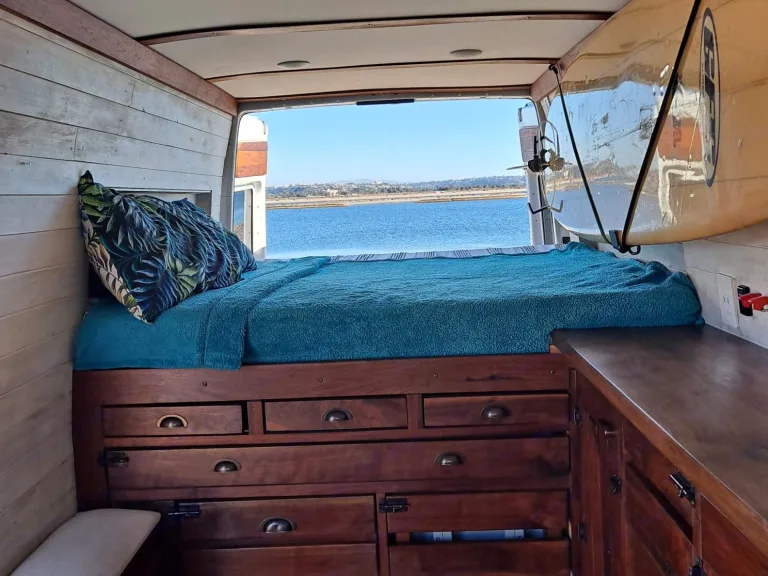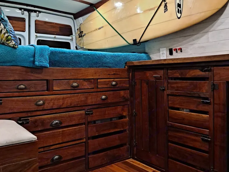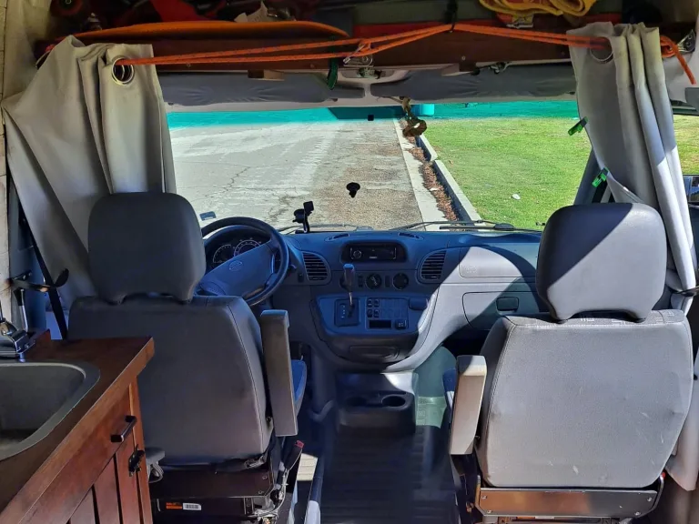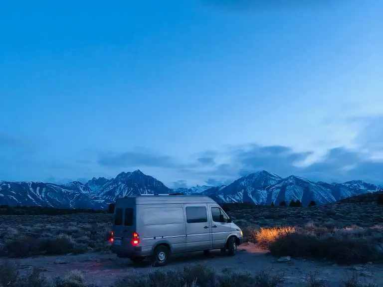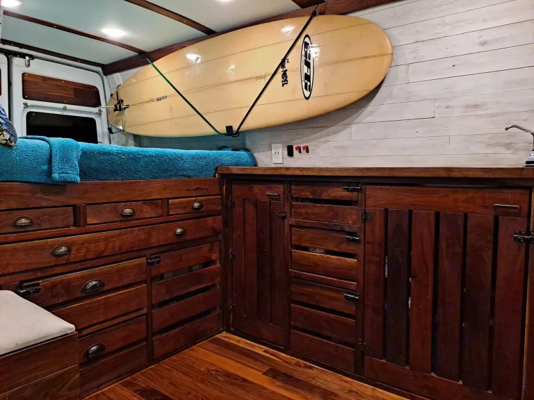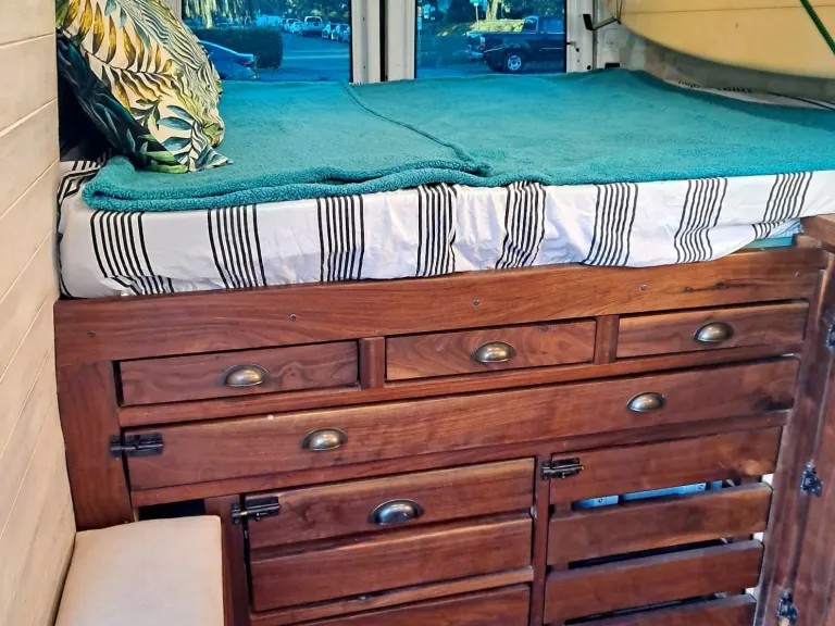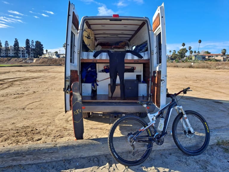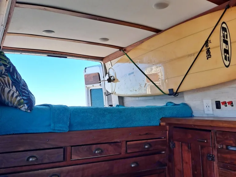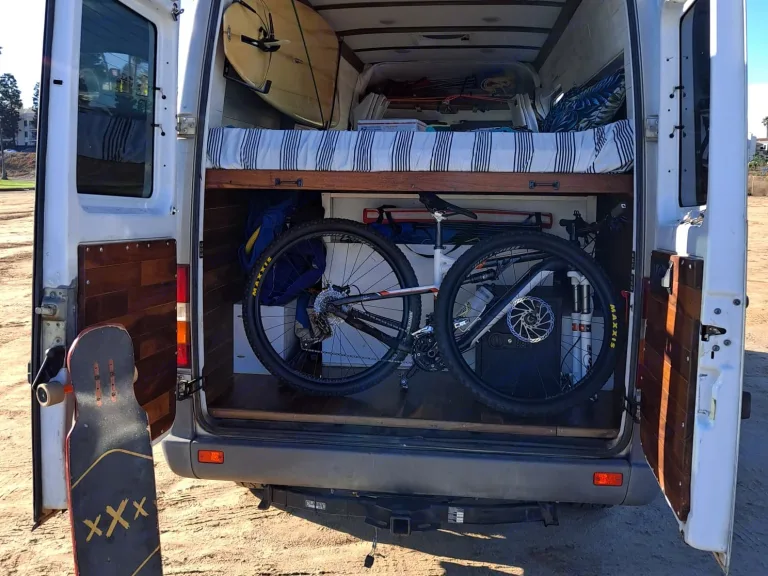 Awesome build on this Sprinter van. All maple wood gives it a homey look. It has bright indoor lights with a dimmer switch, it feels like a tiny apartment. Bring your office on the road with a pull out desk and plenty of in cab storage and even more underneath the bed for more secure storage, only accessible from the back . The power inverter with the solar panels, you can stay charged up and never have to worry about running out of electricity. The alternator and solar panels charge 2 car batteries in the cab.Great off-road tires, this thing is perfect for the desert. No matter where you go, you don't have to worry about being too hot or too cold. It has the option of a battery powered A/c unit that gives you 5 hours of cold air. If you plan on being stationary and need it for more than 5 hours you can also plug it in. The dash A/c blows very cold when the van is being driven. I have a camping-gas powered space heater that doesn't require ventilation that can get the whole space very warm in a matter of minutes. If any of these take up too much space I don't mind holding on to them during your trip, however there is lots of space to store these.It has a powered cooler that runs off the batteries so you never have to worry about running out of power. Super high beam light bar for when you go off road or out in the middle of no where. This is a beast. The 2.7 turbo diesel takes you places and can haul up to 5,000 lbs. And it still gets an average of 17 miles to the gallon!I have other fun toys that are optional if you care to borrow them. Surfboards, a 1 inflatable kayak, mountain bike, boogie boards, and skate boards. None of these are guaranteed but are very likely to be available upon request.The sink has a 6 gallon freshwater tank and another 6 gallon grey water tank. Both drivers and passenger are bucket seats so you can flip around when you want to socialize.Loved it the minute I saw it and would love to share it with you!!What's includedCamping chairs, outdoor solar shower, bike fork mount, safe, gas stove, linens and pillows.
