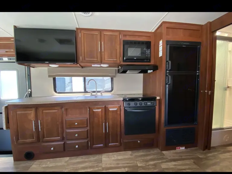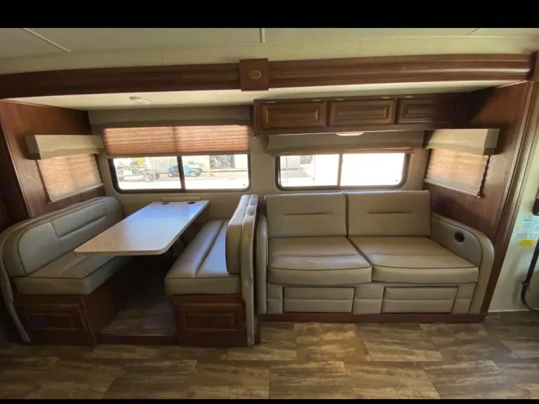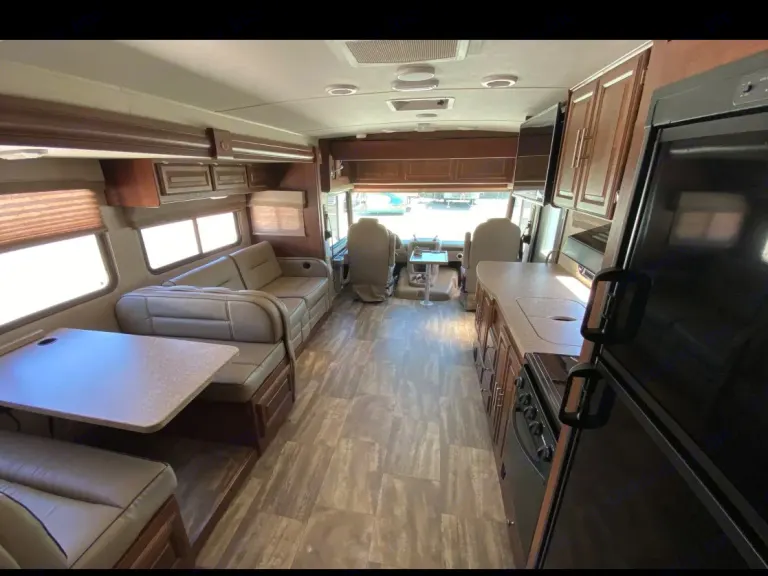 - **Spacious Layout with 2 Slide-Outs – Room to Roam!**: With two slide-outs, this RV opens up into a massive living space where your crew can spread out. At 84 inches of interior height, even your tallest friends can stand tall while you all belt out road trip tunes! [Ref web ID: 6]- **King-Size Bed – Sleep Like a Monarch!**: The private bedroom features a plush king-size bed, perfect for sprawling out after a day of hiking or beach lounging. You’ll wake up refreshed, ready to conquer your next adventure! [Ref web ID: 9]- **U-Shaped Dinette & Sofa – Your Chill Zone!**: The large U-shaped dinette and sofa are ideal for game nights, meals, or just kicking back with a good book. They also convert into extra beds, so your whole squad can crash in comfort! [Ref web ID: 23]- **Front Overhead Bunk – Sleepover Central!**: The front overhead bunk adds extra sleeping space for your spontaneous road trip buddies. It’s like a slumber party on wheels—pillow fights encouraged! [Ref web ID: 23]- **Dream Kitchen – Cook Like a Chef!**: The galley kitchen boasts custom countertops, a microwave, stove, oven, and stainless steel sink with a pull-out sprayer faucet. Whip up gourmet meals or midnight snacks while enjoying the luxury of your surroundings! [Ref web ID: 0] [Ref web ID: 23]- **Entertainment Galore – Fun for All!**: With LED TVs in the bedroom and living area, plus a premium Sony dash entertainment system with AM/FM, Bluetooth, and USB connectivity, you’ll never be bored. Movie marathons, karaoke, or streaming your favorite shows—this RV has it all! [Ref web ID: 0]- **Spacious Bathroom – Freshen Up in Style!**: The full bathroom offers plenty of space to shower and get ready, so you’ll always look your best for those campground selfies. Plus, there’s ample storage for all your essentials! [Ref web ID: 7]- **Night Shades – Sleep In Like a Boss!**: High-intensity lighting keeps things bright for late-night fun, but when it’s time to snooze, the night shades block out the world. You’ll sleep like royalty, no matter where you park! [Ref web ID: 9]- **Optional Thomas Payne Power Theater Seats – Ultimate Comfort!**: With USBs, recline, adjustable headrests, heat, massage, and lumbar support, these seats are a game-changer. You might never want to leave the RV! [Ref web ID: 0]**Why It’s Awesome**: The interior of “The Georgetown Getaway King” is a luxurious haven where comfort meets fun. Every detail is designed to make your trip a blast, from the spacious layout to the high-end features. You’ll make memories that last a lifetime!---#### Why You’ll Have the Best RV Adventure Ever!