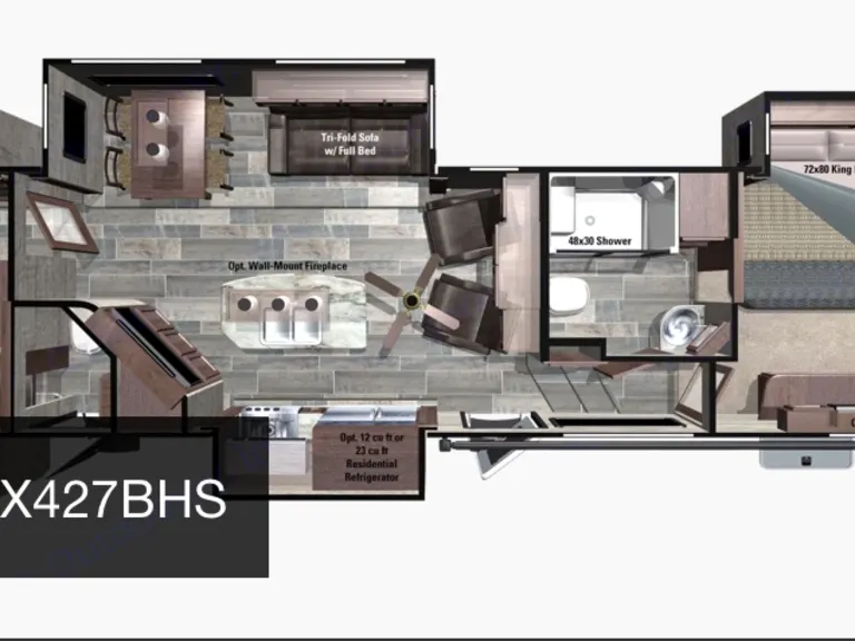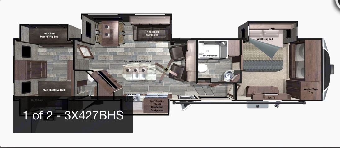 42 foot fifth wheel with master bedroom up front and a bunk room for the kids in the back. Outdoor kitchen too! Easily sleeps 6 but will sleep up to 9 using the pullout sofa in the living room.