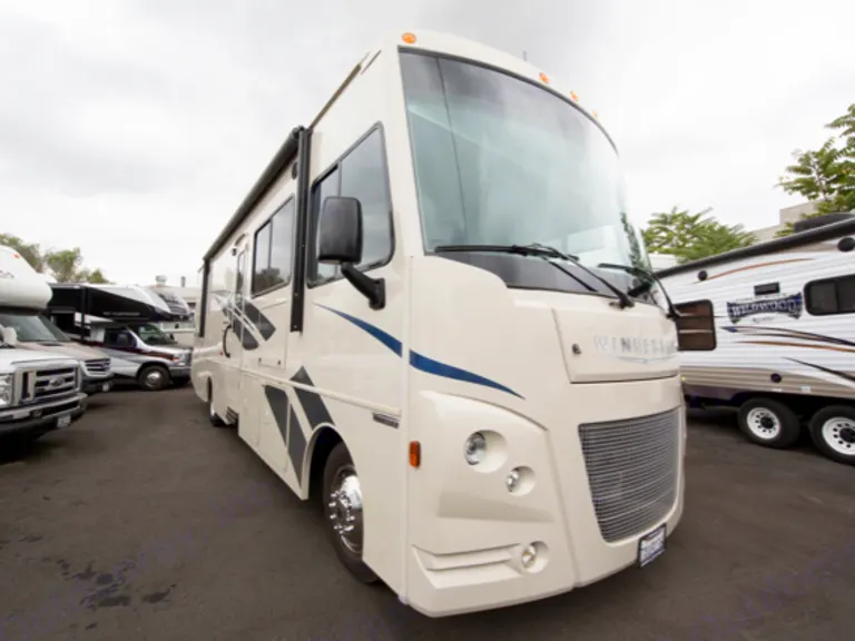 ● Ford V10 EF53 Chassis ● 7 seat belts. ● Sleeps 6 adults and 3 kids ●This 32 Foot Winnebago Vista Bunk RV has the spaciousness and driving visibility of a class A, with the handling of a mid-sized motorhome. The well-designed floorplan maximizes live and sleep space for a larger family or group with its one full-side slide out that further expands the kitchen and living room. The private master bedroom has a walk around queen bed, its own bathroom entrance and ample closet space for two. Additional sleeping quarters include the two twin bunk beds, a convertible dinette and couch, and a full-size over-cab drop down bed. The fully equipped island style kitchen has two bay sinks, an oven, a microwave, a three-burner stove and wide counter space. Additional features include a large 19-foot power awning, an optional solar panel for charging, large external storage, indoor and outdoor Hdtv entertainment and more.Nightly Rates