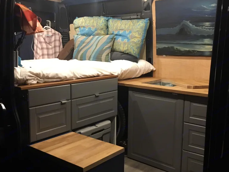 This is a custom adventure van designed to give you the basics for a great road trip. It has a solar panel that charges a small battery bank which powers a ceiling fan and ceiling lighting. There is tons of storage under the bed that can fit two bicycles, gear, and hanging hooks for hiking bags etc. The interior has plenty of standing room and drawers for the essentials like Cutlery, Dinnerware, and pots and pans. There is a large cooler that can hold ice for several days and can also serve as a seat if you want to use the sink counter as a work desk. There is also a Coleman propane stove for outdoor cooking. There is also a folding table and chairs that are very easy to set up for outdoor lounging. The bed is a queen size 4" thick foam pad and the van is wide enough to sleep width-wise. The toilet is a bucket with a lid and special bags and pellets to absorb the odor and liquid. If you are looking for a fully polished rig with showers and bathrooms, this is not for you. If you are looking for a spacious adventure van in a small package that gives you just what you need, this is the way to go. The van is easy to drive and fits in a normal parking space so you have access to more locations. It's also almost brand new so you can have the piece of mind that you will get to your destination without mechanical issues.