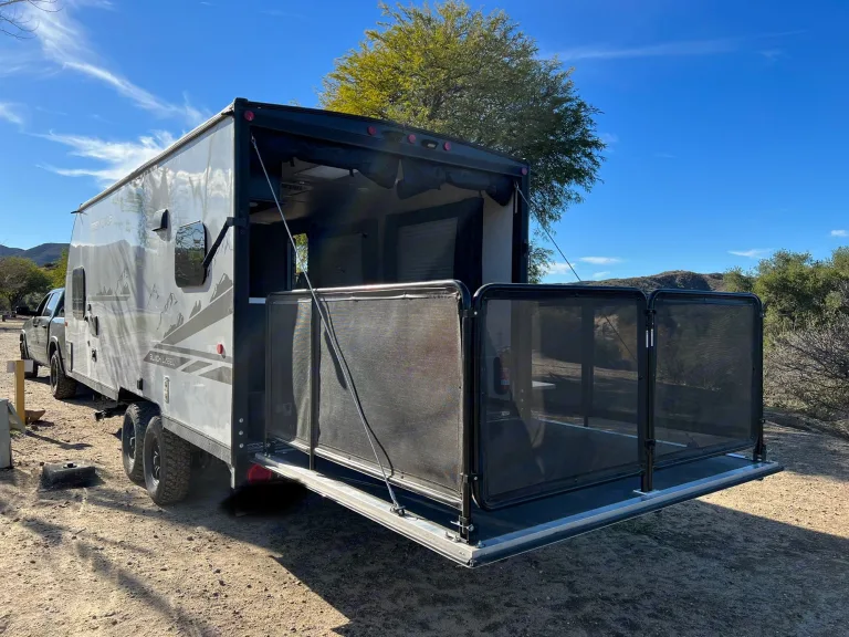 This is a beautiful 2021 toy hauler that fits 2 quads and is easily towed by a large SUV or 1/2 ton pickup. Beautiful ramp patio, huge 12V refrigerator/freezer (that work perfectly) and decent sized bathroom along with gas stove, oven and big kitchen sink. Perfect for a small family and a couple pets! Comes with weight distribution / sway limiting hitch and unlimited generator usage (you just have to provide the gas). Includes cookware, dishes and other necessities.What's included2x camp chairs, camping table, small couch, BBQ, unlimited generator usage. Delivery and pickup within 100mi radius available upon request.RecommendationsWhether you're looking to lounge on the patio at the beach, haul your toys to the desert or cozy up in the mountains, this toy hauler has you covered!With 70 miles of coastline, San Diego County has countless beautiful beaches like San Onofre, South Carlsbad and Silver Strand. We're also within 2 hours of the desert, the perfect playground for all your toys. San Diego County also has dozens of beautiful lakeside and mountain campgrounds if that's more your style!Other things to notePets welcome!