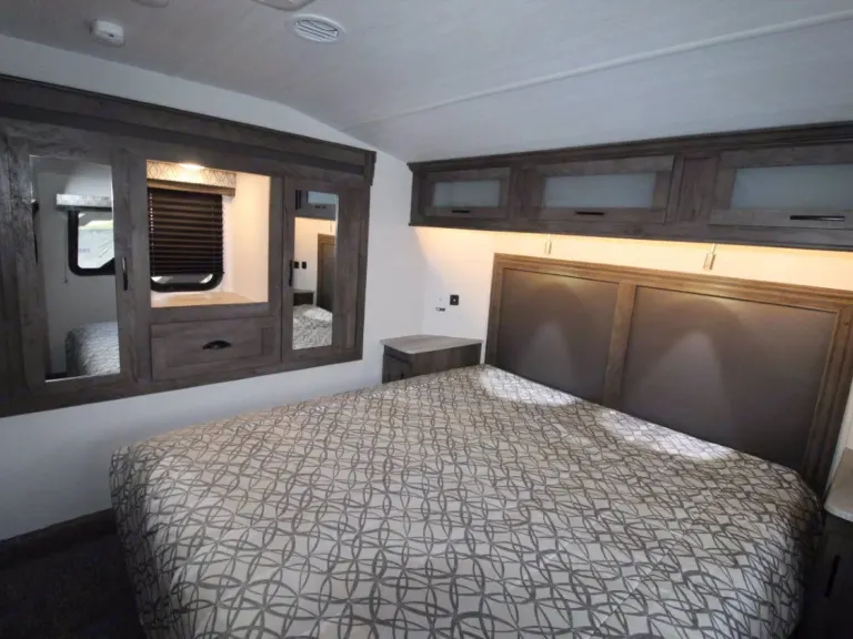 The master bedroom suite, in the front of the coach features a wardrobe closet, overhead compartment and nightstand. The clean queen sized bed will provide the perfect night's sleep.