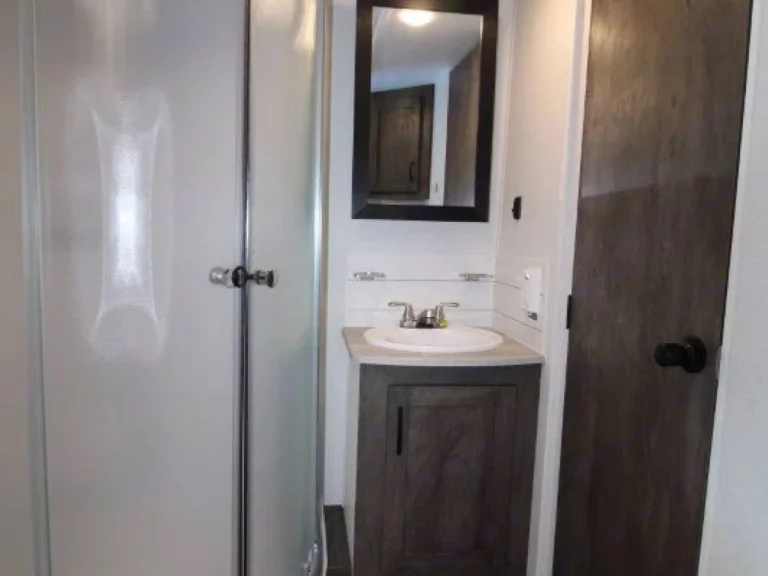 RV Features a bathroom with a full-size shower, toilet, and sink vanity.