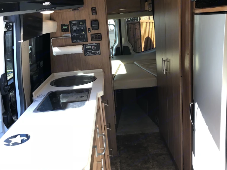 Luxurious Mercedes-based class B motor home. Perfect for a couple looking to get out for a long weekend. 24’ exterior length is small enough for most national and state parks. Best of all, it’s easy to drive and comfortable for longer trips.The area in the back converts to a flat bed, slightly larger than a queen, lots of storage underneath. 2-burner stove, solid surface counters, microwave, and plenty of room in the fridge for all your cooking needs.Wet bath + outdoor shower. There is also solar on the roof to charge the 2 house batteries, and an LP generator if you prefer to camp off the grid completely.