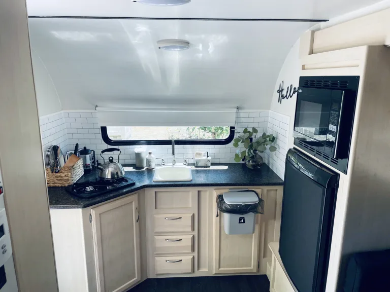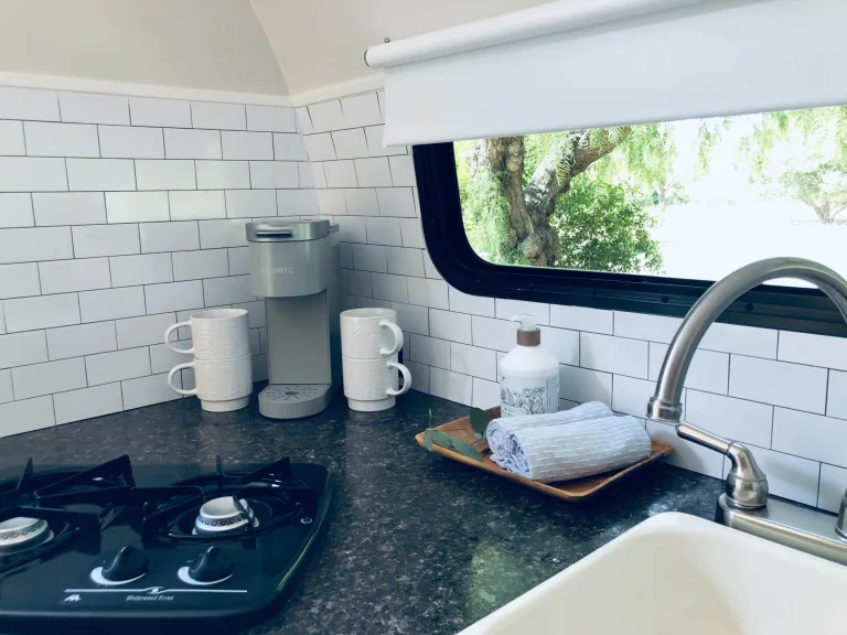 Enjoy the amenities of a bathroom/shower combo and a kitchen that has all you need: a stovetop, convection oven, refrigerator, and sink. We provide cookware, a coffee maker/french press, plates, utensils, and napkins. Our camper is stocked with pillows and linens too!Our camper can be dropped at a campsite you’ve reserved, near the beach as a cabana, or even at your residence for the extra space you may be needing for guests. Depending on the drop location of the camper, amenities of the camper can be fully utilized or may be limited. We have shared in the following descriptions what that looks like for each option.Campsite (Full hook-up with electricity and sewer water)