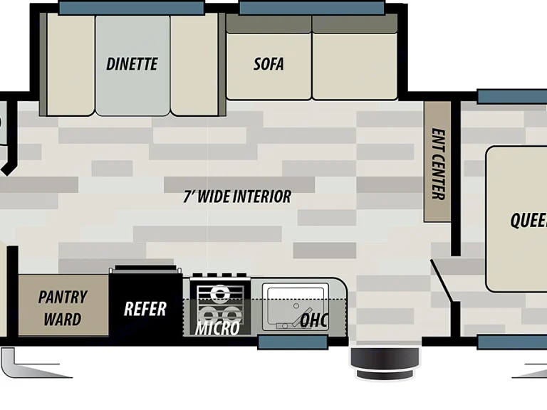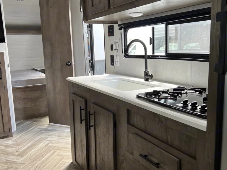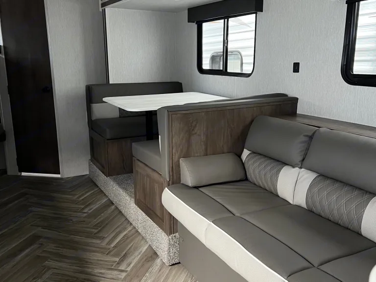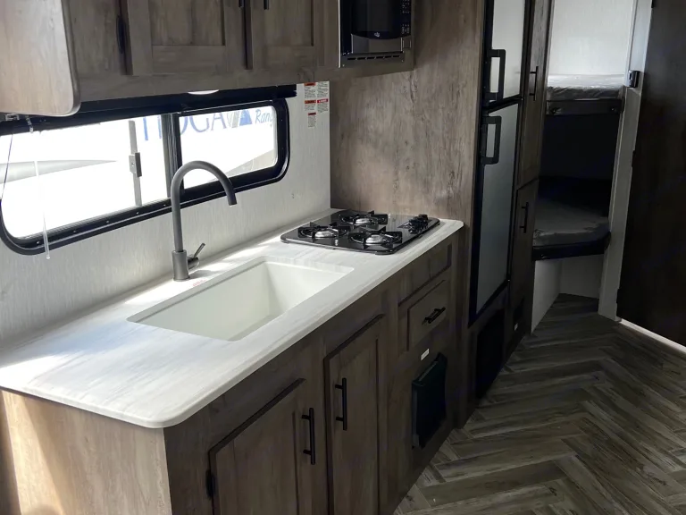 This is a full-sized family travel trailer with loads of upgrades and amenities. The private bedroom features a queen island bed with nightstands. The living and dining area slides out to offer extra roominess and comfort with a full size kitchen with stove top and microwave (does not have oven). The dinette and sofa bed both convert into beds for extra sleeping space. The rear of the trailer features bunk beds and a bathroom.This luxury travel trailer is an excellent choice for family vacations, as a temporary "guest house" for visiting family and friends or as a longer term rental in the event of water damage claims or homeowner's insurance claims.