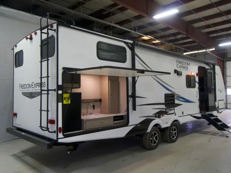 Please Note, This Listing IS Delivery Only - We will deliver and set up camper for a $100 minimum fee within 65 miles of San Marcos. We also have an inverter generator available for rent for primitive/dry camping. The camper has TWO air conditioning units and renter can book either 30 amp site and only use main AC or book 50 amp site to use additional main bedroom AC unit. If the renter's site does not have a sewer hookup, we will require a $50 dumping fee to take care of it for you upon pickup.The trailer has a queen in the main bedroom (includes memory foam topper; bed is nestled between two large wardrobes and an overhead cabinet with reading lights). Two sliding doors shut the room off from the living space. A second bedroom in the rear contains three twin bunks with lighting above each bed and USB ports. The room also has a large storage closet, as well as numerous built-in shelves allow for lots of space to store clothing, games, and other travel necessities! The living room contains a U-shaped dinette which turns into a double bed, as well as two recliners that lay flat, have built in heaters, lights in cupholders, and vibrating settings.Fully stocked kitchen has 2-compartment sink, 3-burner stove top, oven, microwave, large refrigerator, and freezer. Large outdoor kitchen also features an electric-only fridge, a 2-burner propane grill, and a single bin sink. Large TV in living room rotates in mount to provide entertainment in main bedroom, and has lots of storage in entertainment center below.The outdoor space includes large outdoor kitchen, a 15' awning with LED lights as well as outdoor speakers and an outdoor shower with hot and cold water!Feel free to send us a message to inquire about booking!