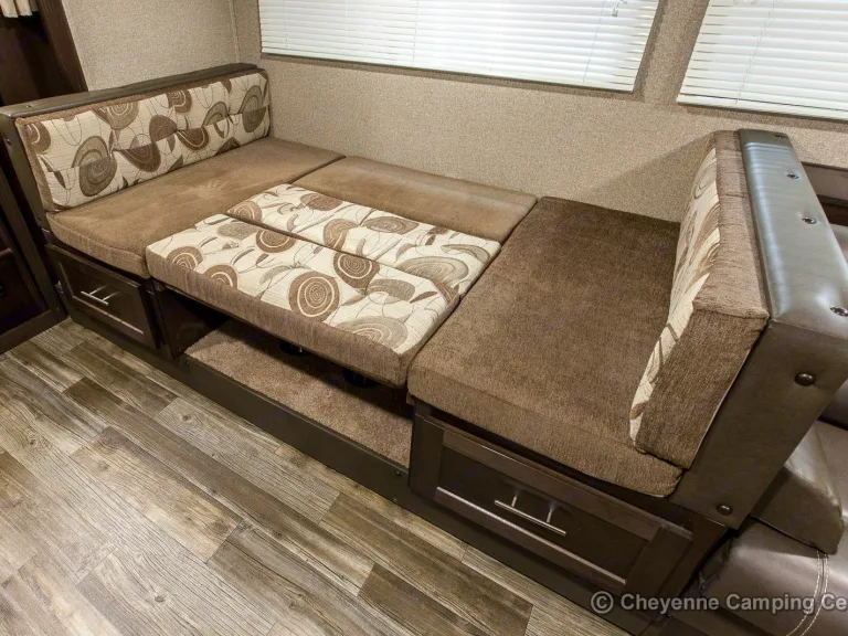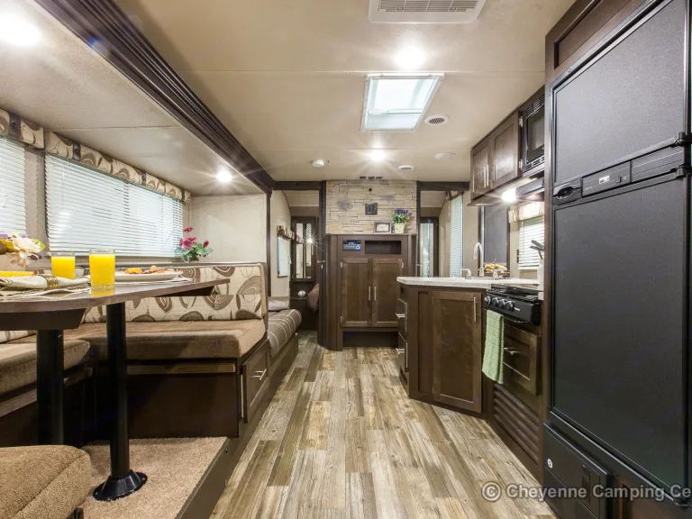Turn Up The Volume! Comfortable living room includes a U shaped dinette table and comfortable love seat. Bluetooth enabled radio with speakers inside and outside. Large TV in living room that can be easily moved to the outside TV mount if needed.