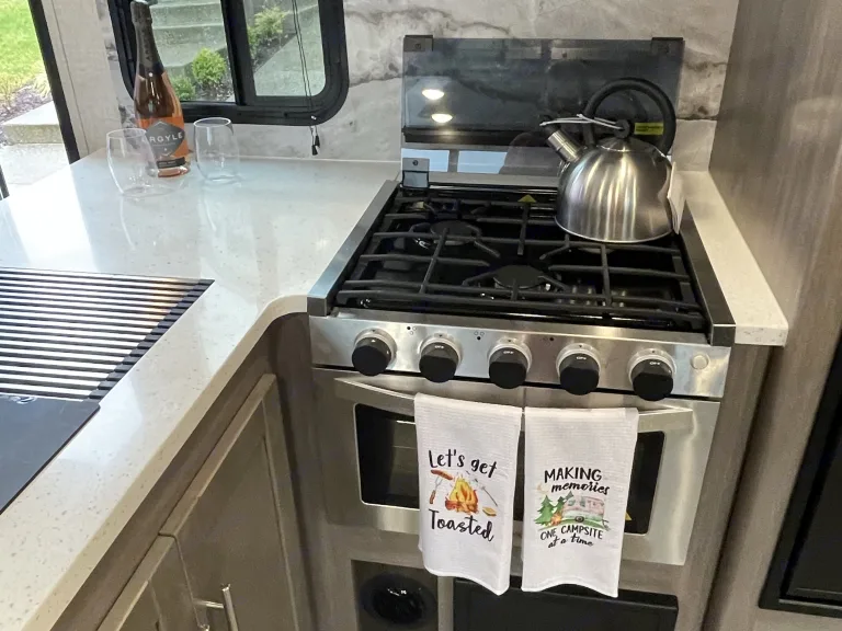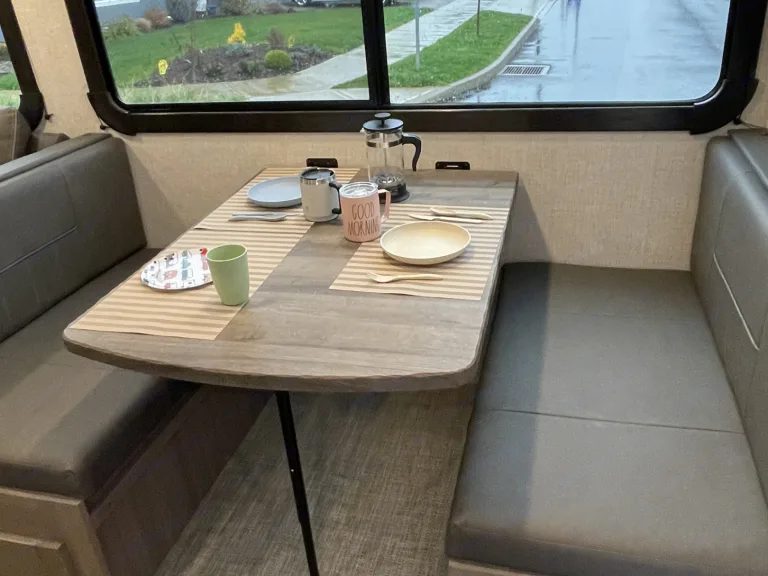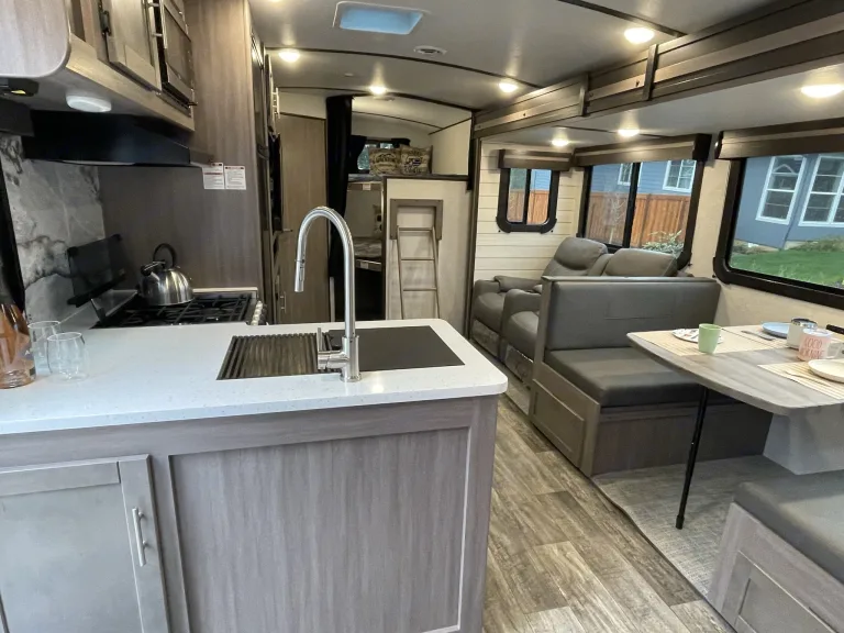 Homey, brand new travel trailer. Only used once so far. Features a dining table plus recliners in the entertainment area. Spacious floor plan with room for your whole family and furry pal!No delivery, sorry! What's includedFresh linens